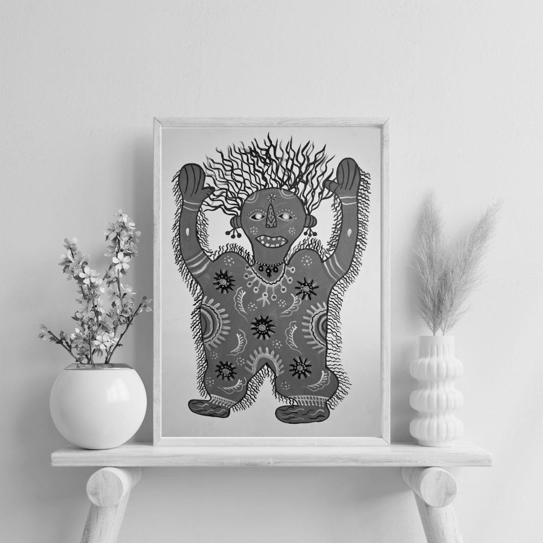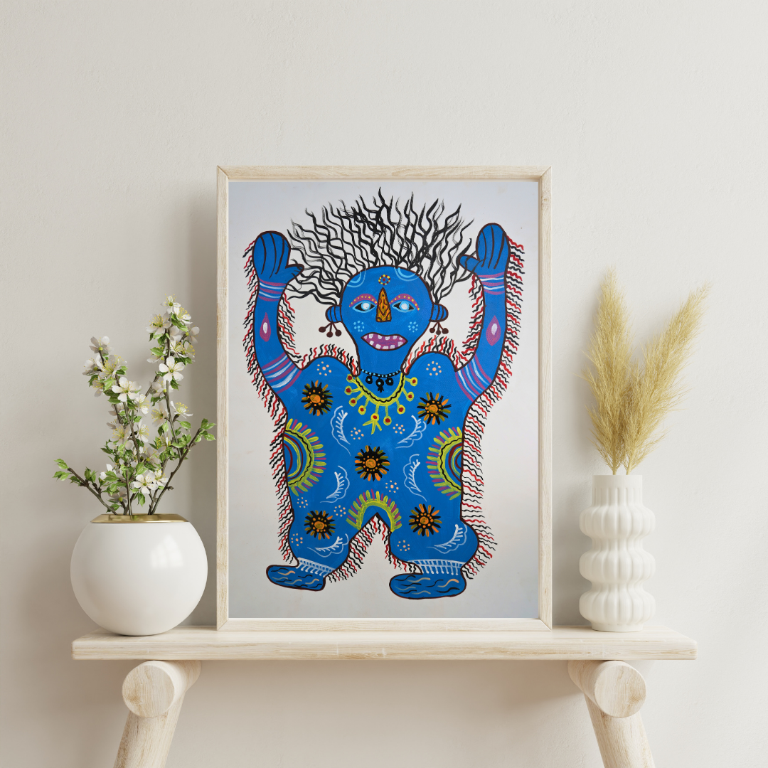The portrayal of Ratmayi reflects Baiga rituals and storytelling traditions by depicting the character as a symbol of spiritual power and connection to the supernatural. In Baiga folklore, Ratmayi is often associated with ancestral spirits or deities, and her representation in art captures the mystical and protective aspects of these figures. The imagery ties into oral storytelling traditions, where such figures play key roles in guiding, protecting, and imparting wisdom to the community through ritualistic practices.