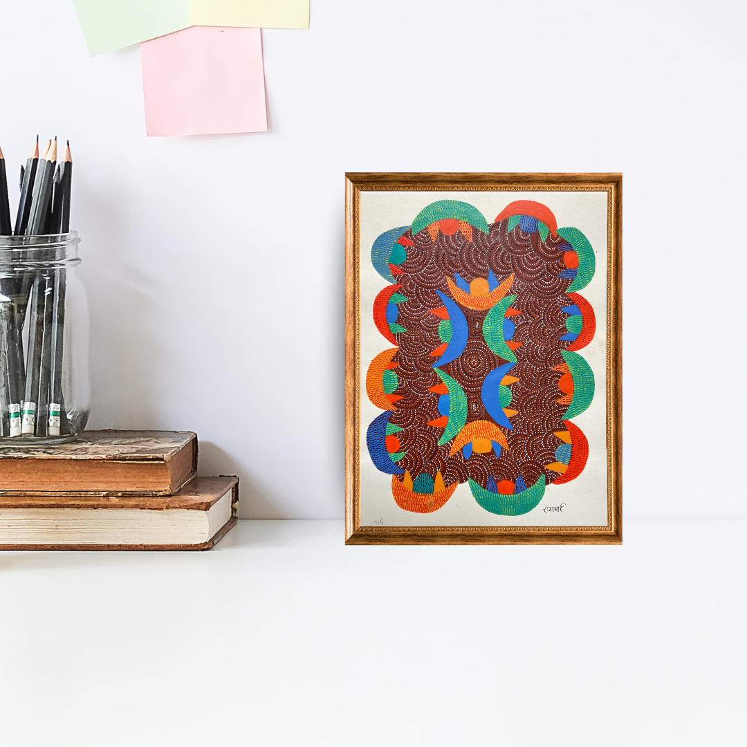 In Indian culture, rangoli welcomes prosperity and happiness; in Gond tradition, patterns are sacred carriers of energy. Rambai blends these two worlds masterfully, using earthy browns and vivid blues, greens, and oranges to evoke both harmony and celebration. The result is a stunning visual dance that brightens any wall while honoring ancestral wisdom.