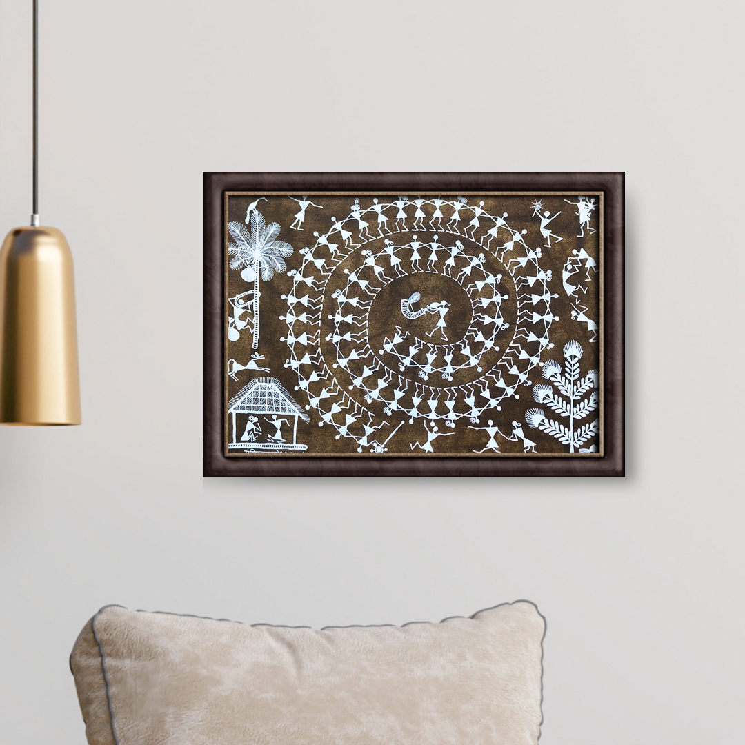 Painted on a cow dung base with acrylic and poster colors on Majarpat, this mesmerizing artwork captures the Warli folk immersed in the joyous Tarpa Dance. At the joyful heart of the scene, a musician blows the Tarpa instrument, setting the rhythm for the dancers who move in perfect harmony. The Warli patterns bring the celebration to life and depict community, unity, and the cultural traditions of the Warli people. This artwork beautifully reflects the spirit of festivity and togetherness.
