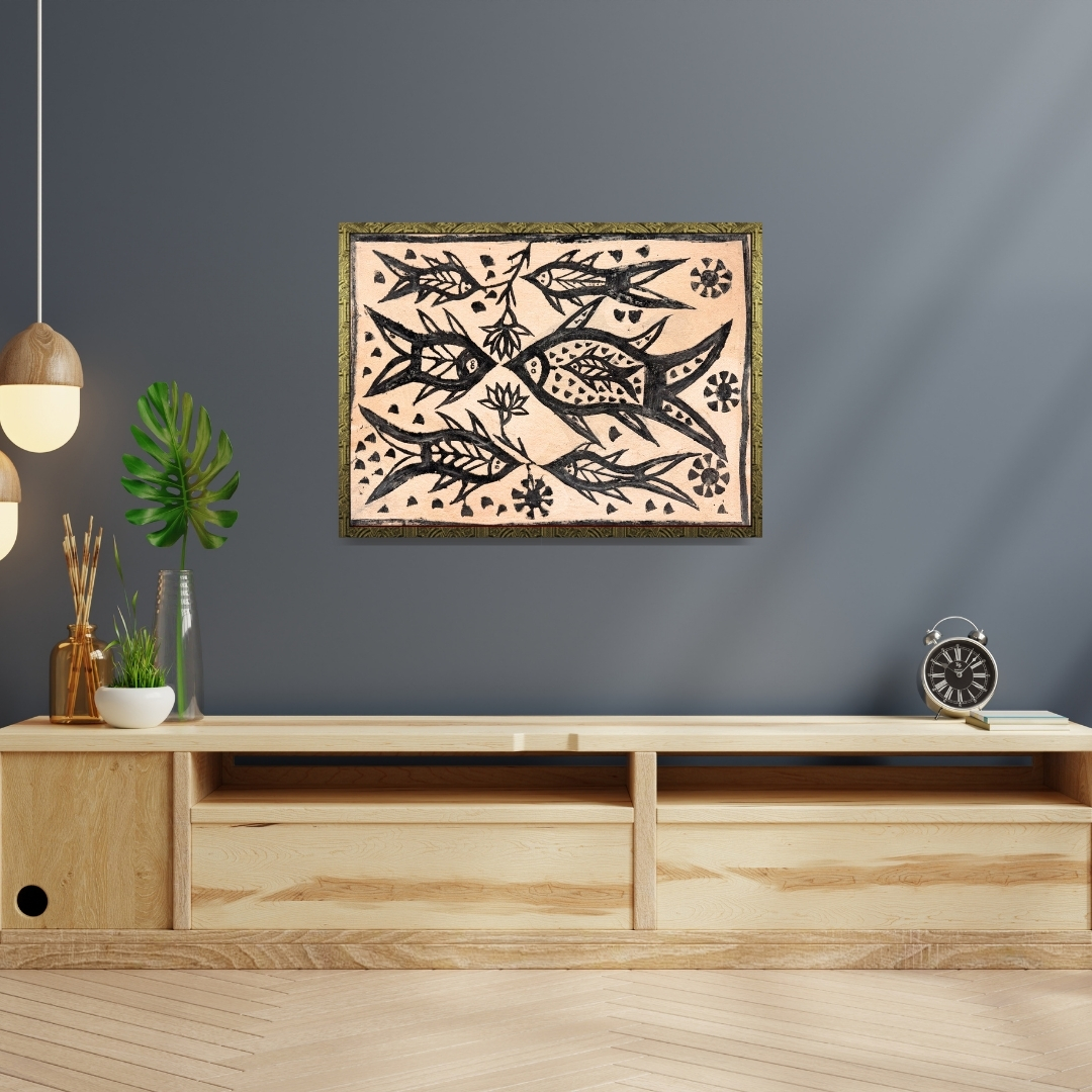 Ripples of Kinship flows with the rhythmic harmony of Khovar art, where every line and curve embodies the unity of life beneath the surface. The intertwined fish glide through a tranquil pond, symbolising fertility, continuity, and the nurturing spirit of nature.