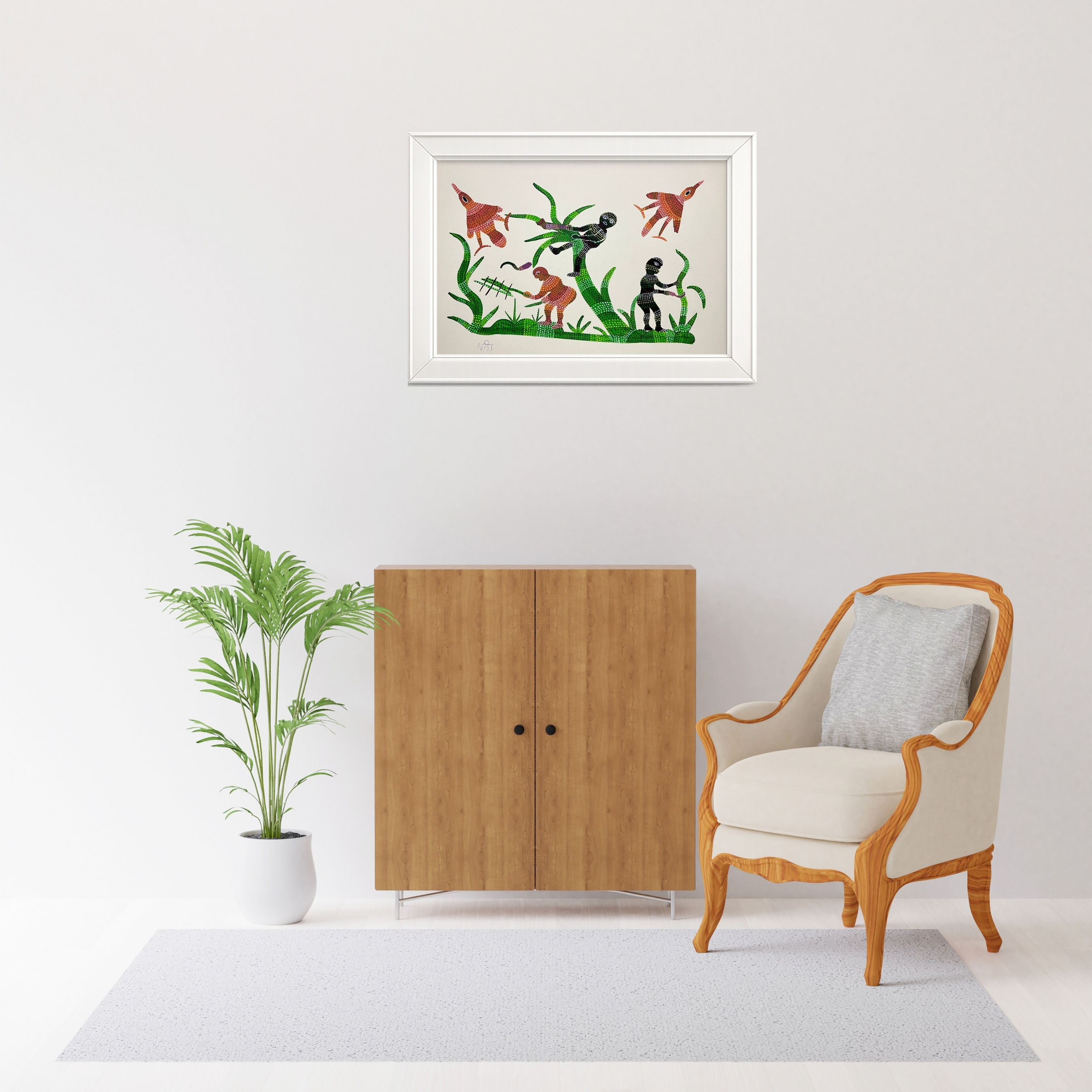 Orange birds and dark human-like figures move through a cascade of green vine-like forms in this handmade painting by Lado Bai, their bodies tumbling and climbing through the composition with an energy that feels both playful and ceremonial. The green vines twist and branch across the paper with spreading, root-like fingers, their surfaces covered in fine white and dark dot patterning, while the orange birds are scattered among them in various postures of flight and rest, their warm terracotta bodies patterned with pink and dark dots. Two small dark figures, their bodies banded with white and coloured dots, cling to the vines with the ease of creatures entirely at home in this vertical, tangled world. Painted in acrylic on paper, the composition dissolves the boundary between human, animal and plant, presenting a Bhil vision of ritual life where creativity itself is a force of nature, inseparable from the forest and its inhabitants.