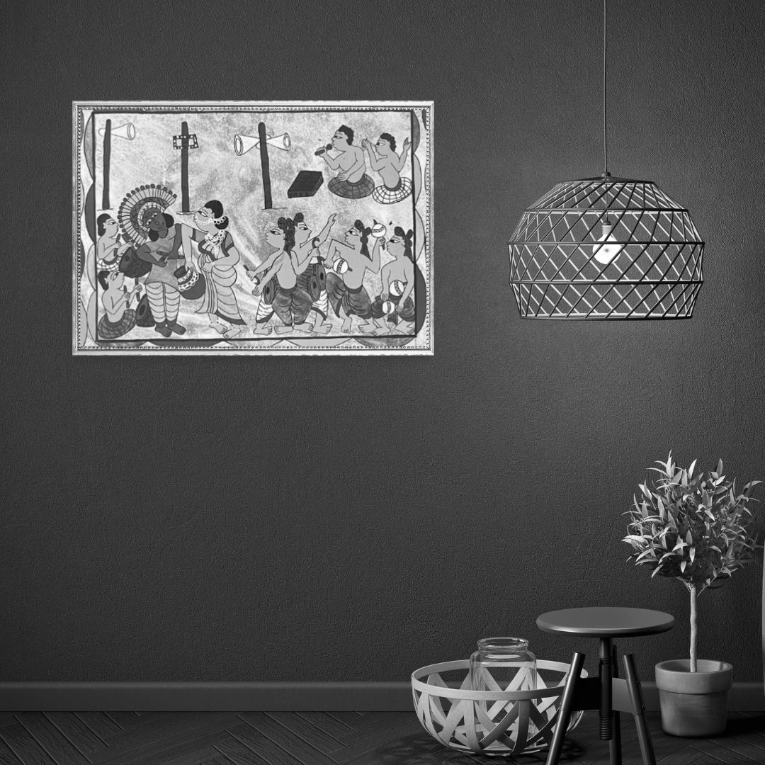 The painting unfolds as a vibrant narrative of communal celebration, where figures gather in rhythmic alignment to mark moments of ritual and festivity. Men and women appear in purposeful gestures—carrying offerings, playing instruments, or participating in ceremonial acts—each rendered with confident contour and filled with fine linear detailing. The arrangement spreads across the surface like a visual procession, allowing multiple moments of activity to coexist within a single balanced composition.
