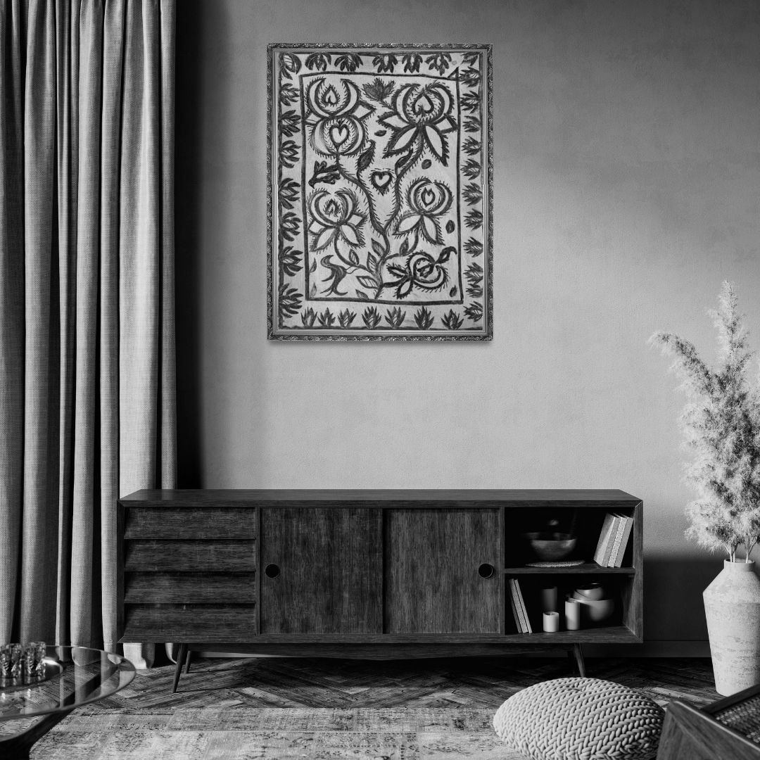 - The layered floral arrangement recalls the decorative tradition of Khovar walls, now preserved on paper.