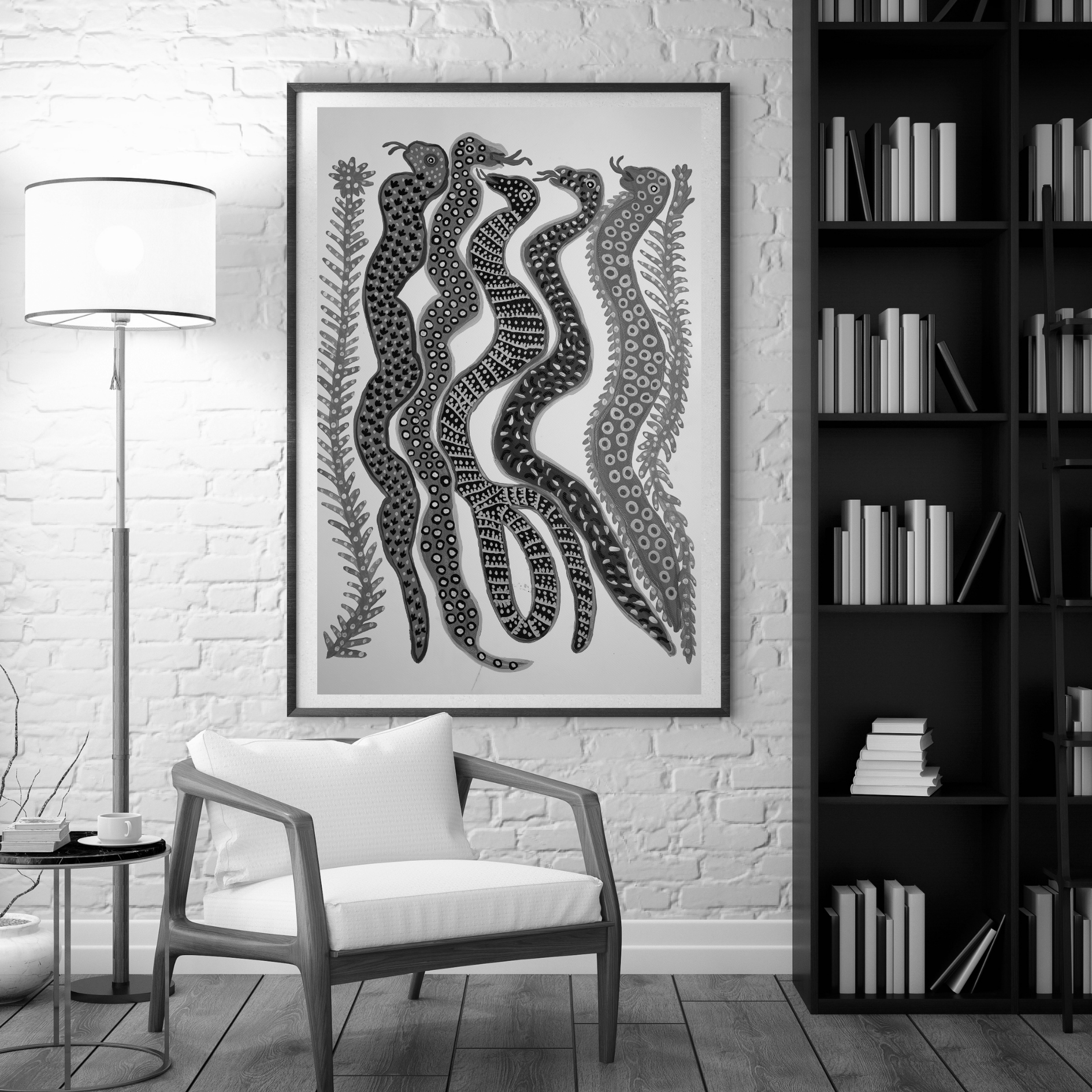 In this artwork, the depiction of snakes, each with their own vibrant and detailed patterns, serves as a powerful metaphor for the diversity of life and the ways in which organisms adapt to their environments. The variety in the snakes’ designs represents the multitude of survival strategies that different species employ to thrive in their specific ecological niches. The serpentine shapes, twisting through the piece, evoke a sense of constant movement and evolution, illustrating that adaptation is not a one-time event, but an ongoing process essential for survival. The green foliage in the background suggests that life is deeply intertwined with its environment, and the survival of creatures like these snakes depends on their ability to blend and coexist with the natural world around them.
