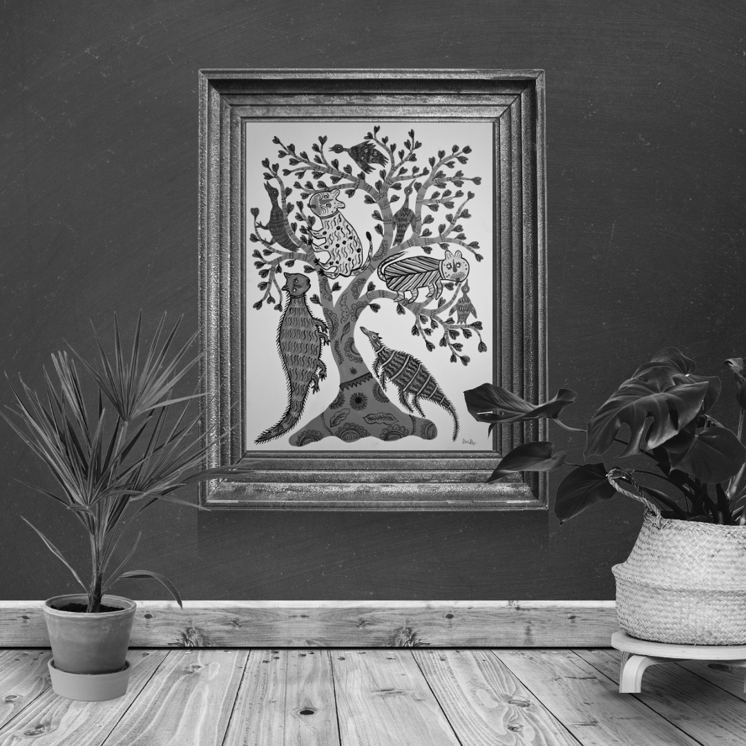The coexistence of the predator (tiger) and the smaller creature (squirrel) in that harmony in nature is based on balance and interdependence. It reflects the idea that even opposing forces, like predator and prey, are part of a larger natural order where each plays a vital role in maintaining ecological equilibrium. The artwork highlights the nature cycle of life, where both strength and vulnerability coexist in harmony.