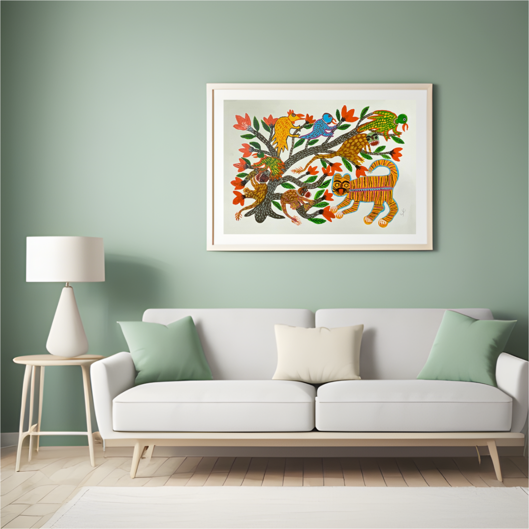 This artwork shows the interaction between the tiger, birds, and tree often embodies a rich tapestry of symbolism, reflecting the community's relationship with nature and the spiritual realm. The tiger, a symbol of strength and power, represents challenges or natural forces that demand respect and caution. Birds, associated with freedom, resilience, and spiritual communication, signify the tribe's ability to rise above obstacles and connect with higher realms. The tree, a universal emblem of life, growth, and protection, anchors the narrative by symbolizing stability, ancestral roots, and shelter. Together, these elements narrate themes of coexistence, the balance of power between strength and vulnerability, and the community's resilience in overcoming challenges while maintaining a profound connection to the natural and spiritual worlds.