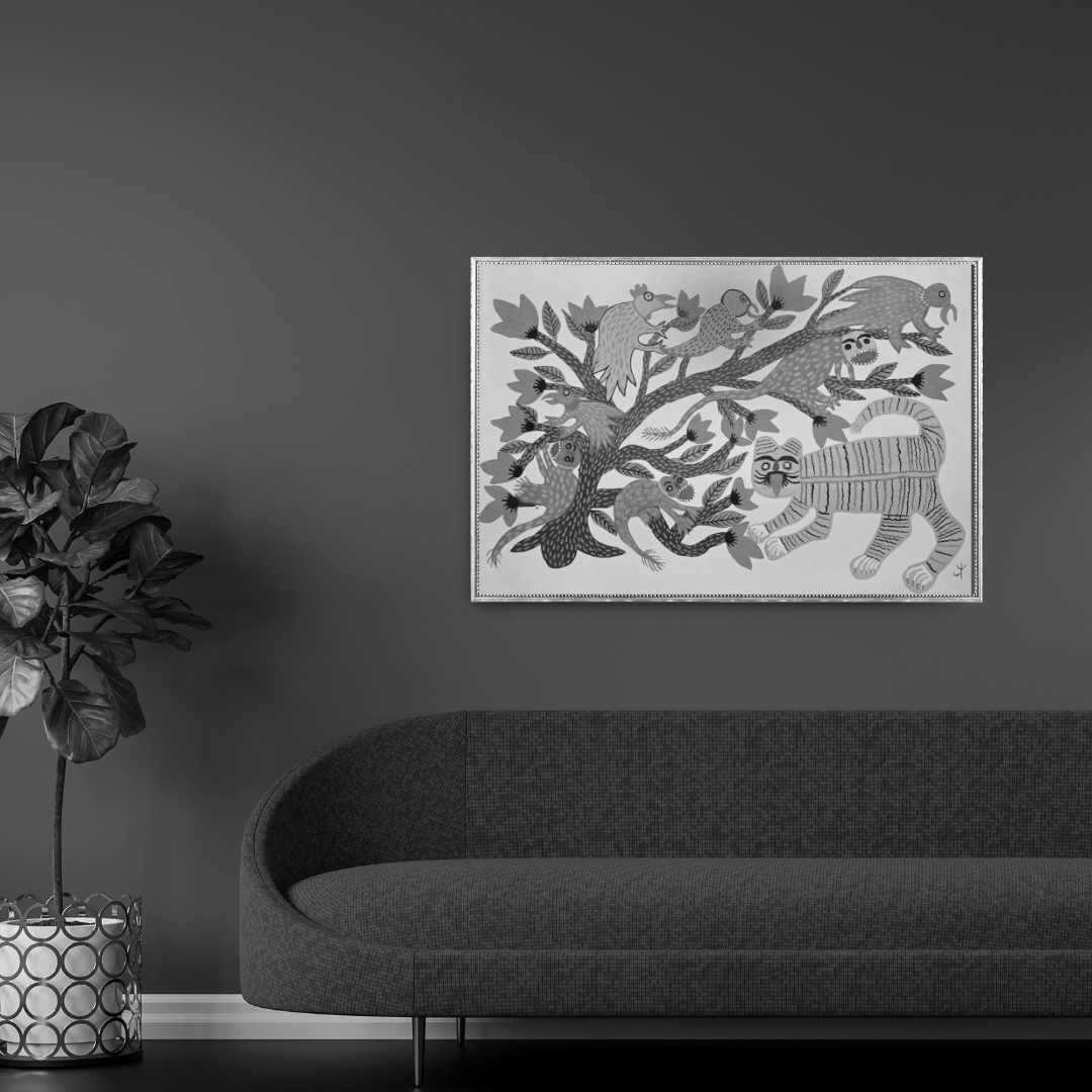 In this striking tribal composition, the mighty Semer tree rises like a guardian spirit The artist weaves a sense of ritual into the composition — the gathering feels less accidental andmore like a sacred congregation of thewild,drawnbythetree’s timelessembrace