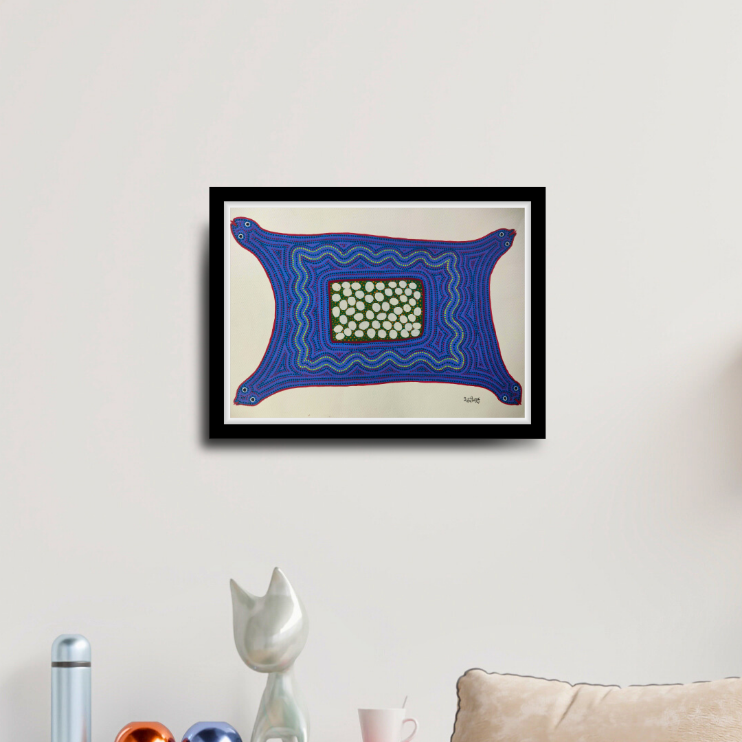 Padma Shri Bhuri Bai is a celebrated artist who has won accolades for her artistry, and this painting by her is a beautiful addition to any home. In this Bhil artwork, a four-headed blue serpent stretches across the canvas in a protective embrace, shielding her delicate eggs as they rest within. Her flat, elongated form exhibits power and grace. This is a symbol of maternal instinct. The intricate patterns and bold hues reflect the rich traditions of Bhil artistry, where nature and mythology intertwine. Measuring 22x15 inches, the painting is easy to display in any setting. This size allows the detailed patterns and storytelling to be appreciated, bringing a unique cultural touch to the space.