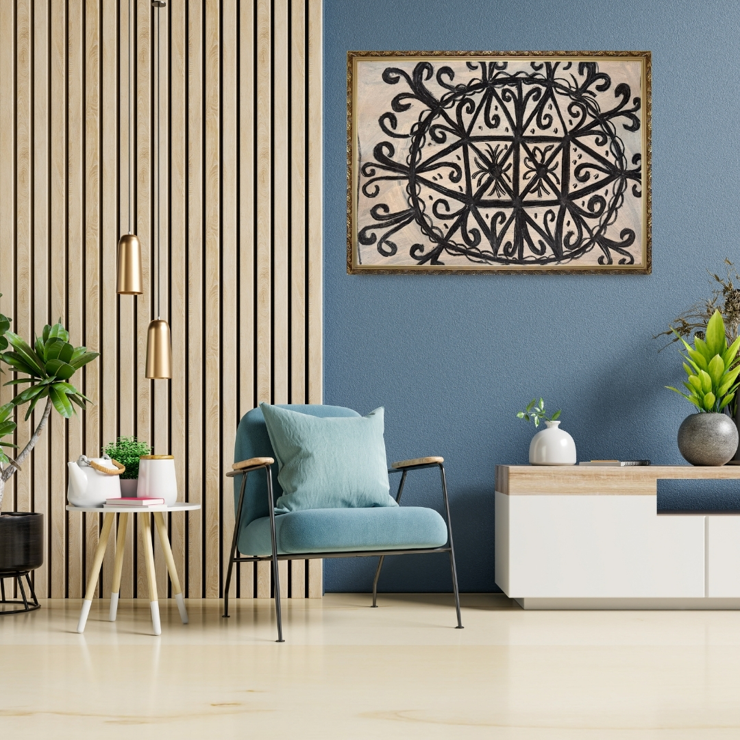 Shaadi Chowk I by Rudan Devi captures the sacred geometry and ritual symbolism central to Khovar art traditions. This work represents the ceremonial chowk, a sacred square or mandala-like design drawn during tribal weddings to bless the union of the couple. The painting’s concentric patterns, anchored by fluid floral and spiral motifs, symbolize fertility, protection, and the cyclical nature of life.