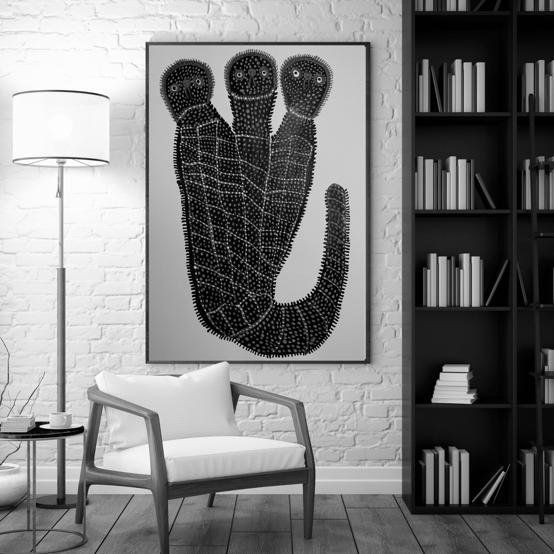 The artwork Shesnaag Timuhi by Baiga artist Sheshnaag Timuhi beautifully encapsulates the role of serpents in Baiga folklore as symbols of creation and cosmic balance. The three-headed serpent depicted in the artwork represents the primordial force that emerged from the cosmic egg to shape the universe. This serpent not only symbolizes the creation of the world but also supports the earth, maintaining cosmic order and harmony. The three heads—signifying the past, present, and future—highlight its timeless connection to the cycle of existence. By portraying the serpent as both a creator and sustainer, the painting profoundly reflects its central role in Baiga beliefs about the origins and balance of the universe.