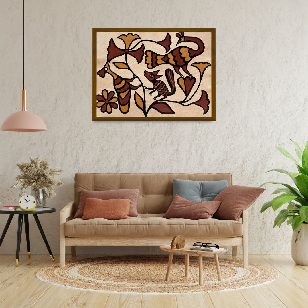 The artist uses rich, natural pigments and rhythmic lines to depict harmony and renewal, celebrating the nurturing essence of the earth. The peacock’s regal stance, the curious squirrel, and the flowering branches unite in a scene that radiates balance, abundance, and quiet joy — hallmarks of traditional Sohrai storytelling.
