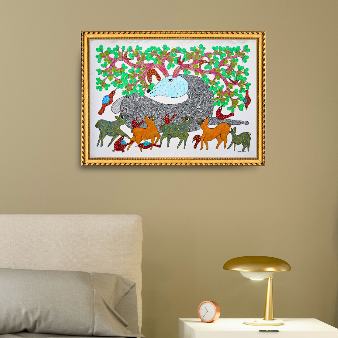Perfect addition to your Home Decor – Authentically hand-painted Gond painting, infused with the joy of a forest family.