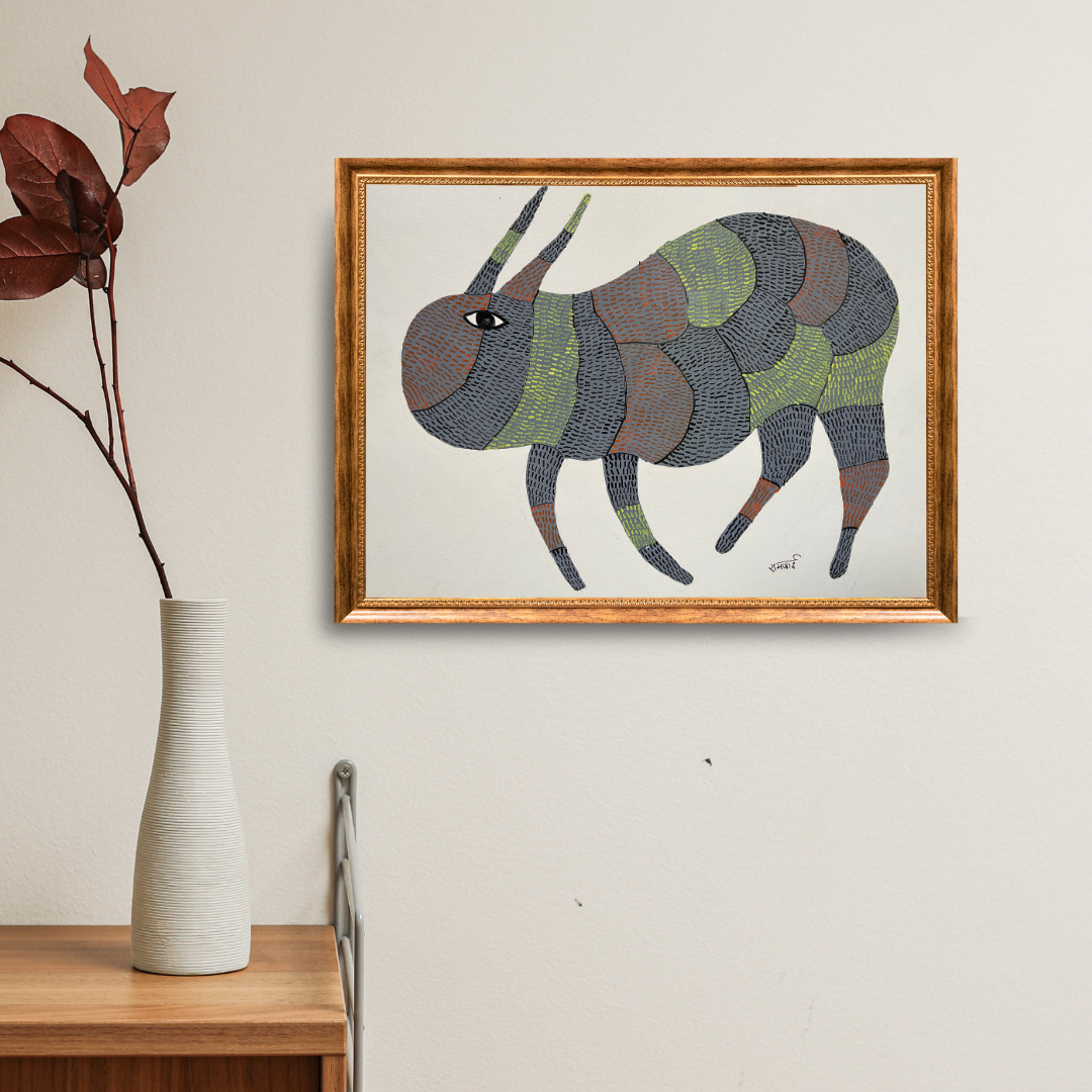Step into the serene world of Gond tribal art with this exquisite painting by acclaimed artist Rambai. A gifted storyteller through brush and pigment, Rambai brings to life the soulful narratives of wildlife and tribal traditions, where animals embody cultural wisdom and spiritual meaning.