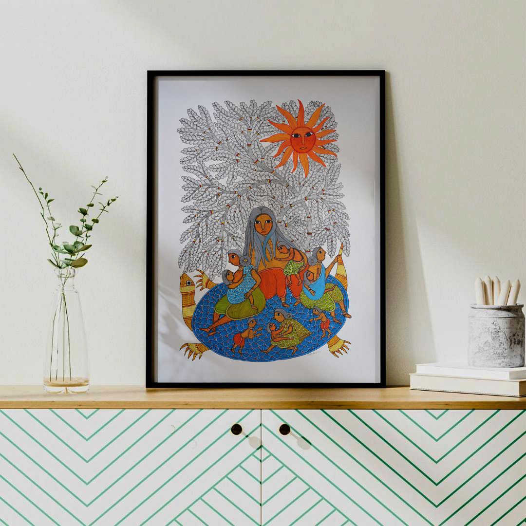In this enchanting Gond painting, Rajendra Shyam weaves a radiant picture of motherhood and nature, celebrating their sacred connection in the Gond cosmos. At its centre, women cradle their children while seated upon a majestic blue turtle, an enduring symbol of strength, protection, and the primordial foundation of life. Above them rises a graceful white tree, its branches outstretched in a sheltering embrace, while a golden sun bathes the scene in warm and nurturing light. Shyam's signature details with rhythmic lines, organic motifs, and vibrant hues draw the viewer into a world where every element exists with purpose and connection. Whether you're a seasoned collector or a first-time admirer of tribal art, let this piece invite you into the rich storytelling traditions of Gond culture.