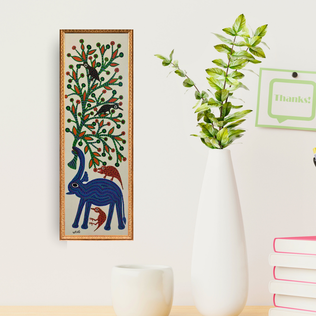 Elephants and birds are both great symbols of positivity, freedom and peace, and this painting wonderfully symbolizes how they thrive together in harmony. Adding this Bhil art painting to your homes, is sure to inspire some of these positive vibes in your surroundings too! The painting measures 22x7.5 inches, making it suitable for vertical spaces. It is a unique piece for art collectors and enthusiasts who appreciate the beauty of handmade tribal art.