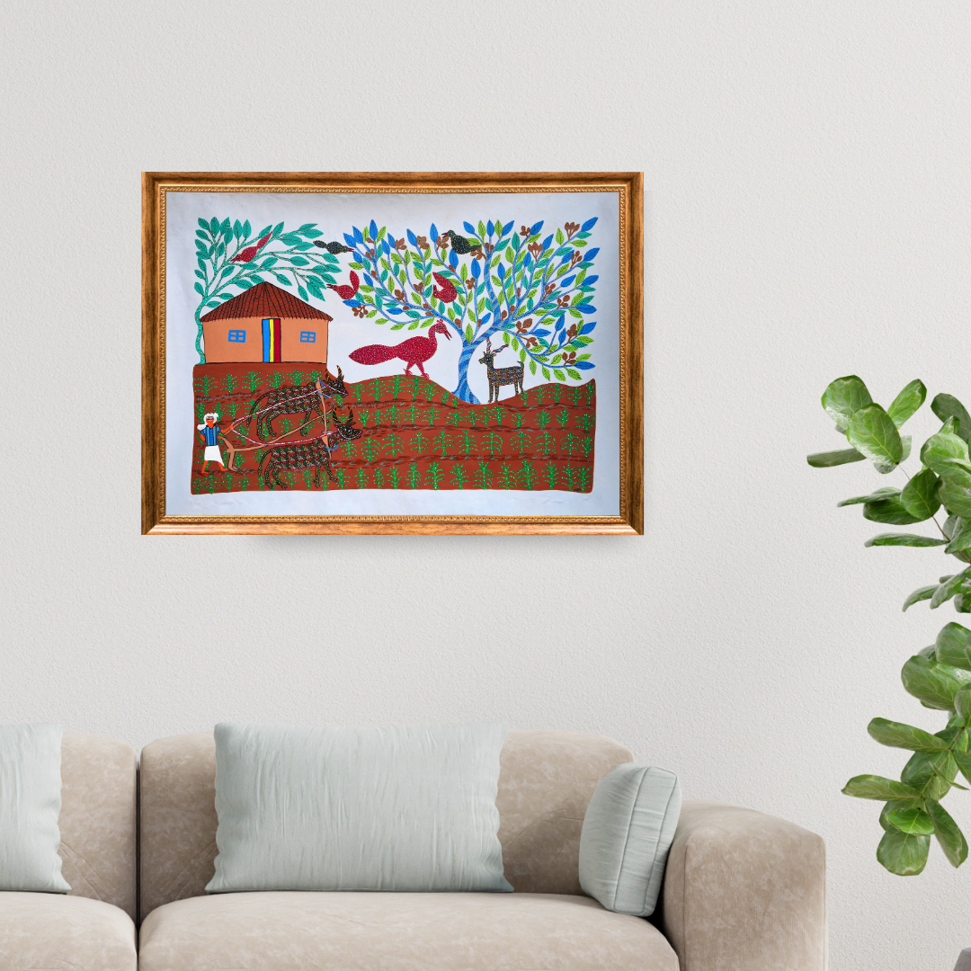 Artist Ram Singh Bhavor, a tribal artist from Madhya Pradesh, is known for his work in keeping the beauty of Indian tribal art alive. As an artist who has always been fascinated by animals and trees, his paintings depict the subjects related to cattle, nature and other elements of the tribal or 'adivasi' lifestyle. In this painting, he showcases a scene from a tribal Bhil village where a farmer is seen at work on his field. Along with his cattle, he ploughs the field; meanwhile, in the background, a simple native scene unfolds. A small house in a corner surrounded by trees and birds. A peacock and a deer standing on the corner of the farm add the lively essence of tribal India. Each element in this painting is a deeper meaning symbolising sustenance, courage, harmony and the interdependence of nature and humans. In this artwork, a combination of cool colours and earthy tones comes alive on the canvas, transporting the viewers to the heart of the tribal village.