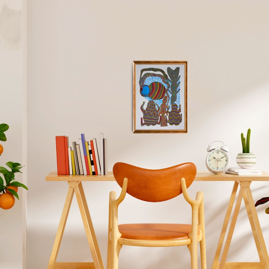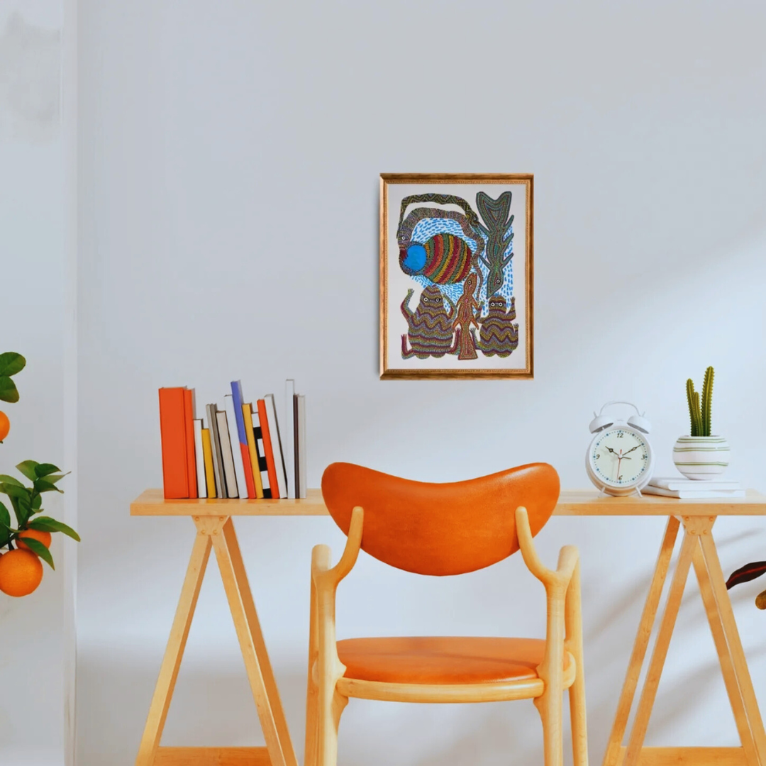 In "The Forest Gathering," Ramesh Katara, a Bhil artist, brings to life a lively mix of forest creatures in a joyous tribute to nature. Using his unique stippled dot technique, he paints frogs, lizards, snakes, and a large insect-like creature that curls around a bright blue orb—perhaps a symbol of water or the Earth. These animals are dressed in colorful, rhythmic patterns and set against a backdrop of blue droplets, evoking the idea of rain or a water-rich environment. The artwork feels whimsical and carries a deeper meaning, representing the unity, diversity, and sacred connection that all living beings have with their surroundings.