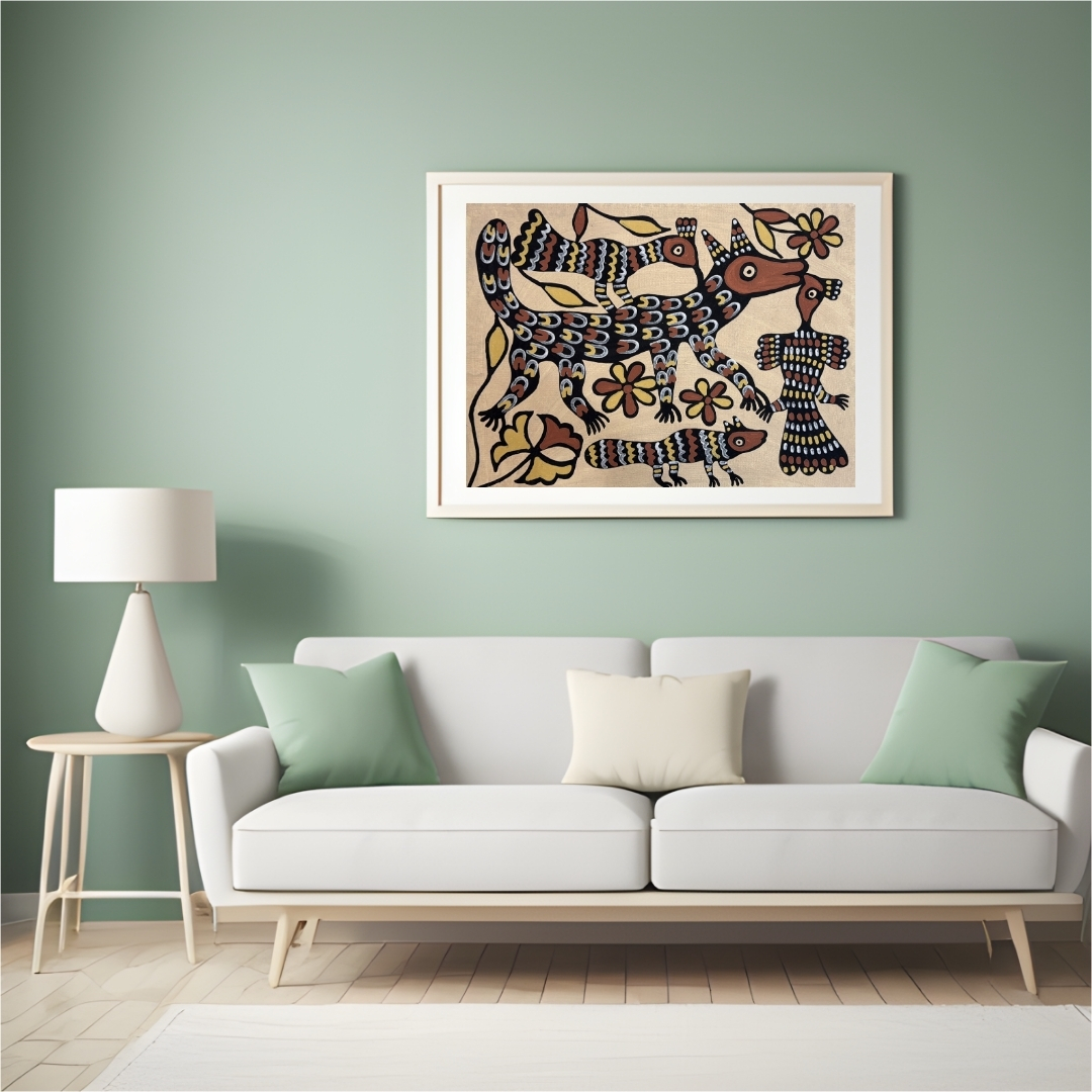 - A rare contemporary Sohrai piece showing ecological harmony.