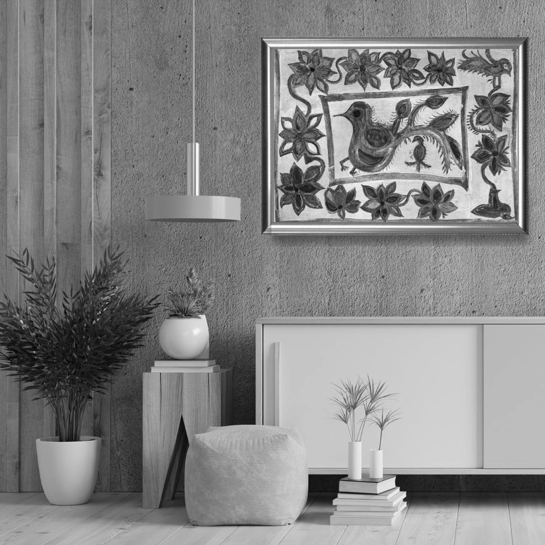 Keeper of the Harvest by Malo Devi is a 2018 work where Malo Devi reimagines the elephant—a recurring Khovar symbol of endurance and prosperity—with striking simplicity. The “One Ear Elephant” becomes an emblem of wisdom in imperfection, adorned with circular motifs that reference seeds and harvest cycles. The minimal palette of charcoal grey and white heightens its primal energy.