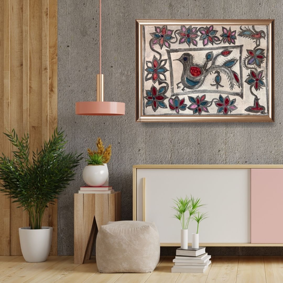 - Natural pigments ground the piece in the tactile beauty of folk craft.