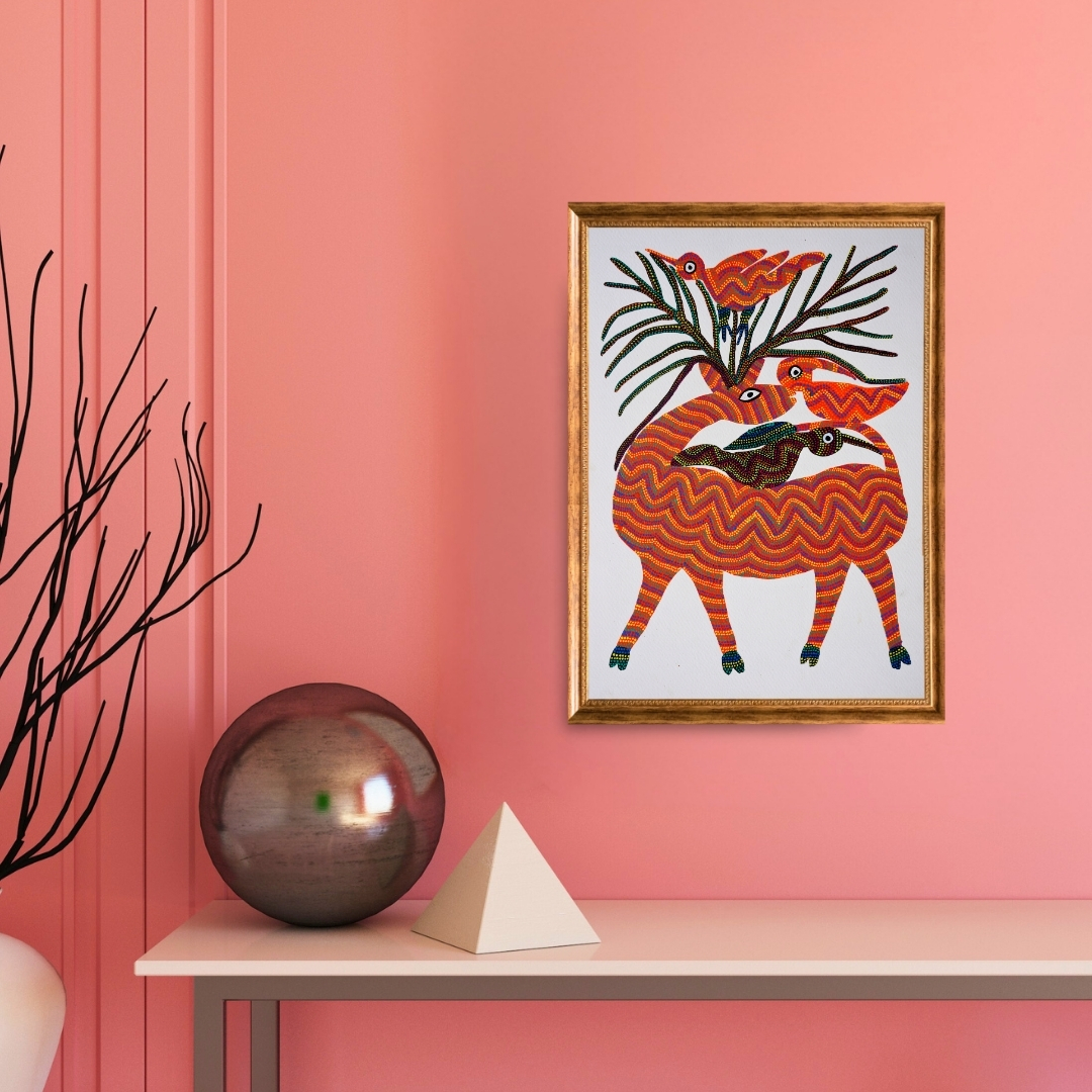 Ramesh Katara, the Bhil artist, has created this painting in the Bhil style. The piece, titled "The Gentle Guardian," depicts a deer-like creature that shelters several birds within its body and antlers. The patterns on the animals are designed in zigzag and dotted styles, featuring vivid colours of orange, red, and blue. This representation symbolises strength and nurturing. The birds, showcasing various colours, nestle comfortably on and around the creature, with some appearing to rest within its form. This composition reflects the Bhil philosophy of mutual respect and harmony among species, illustrating how animals and birds coexist in a sacred natural balance.