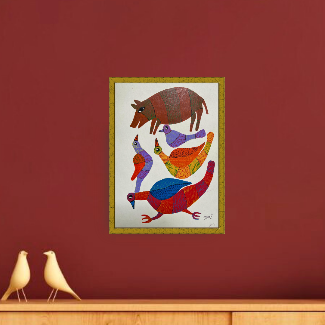 Wild Companions by renowned Gond artist Rambai is a stunning celebration of indigenous harmony, where nature’s contrasting forms come alive in a symphony of colour and detail. At the heart of this 11x15 inch composition stands a boar, solid and grounded, painted in rich, earthy browns with green stripes. Surrounding it, a flock of birds in radiant reds, blues, yellows, and purples brings vibrancy and balance to the scene, each rendered in meticulous linework and tribal patterns.