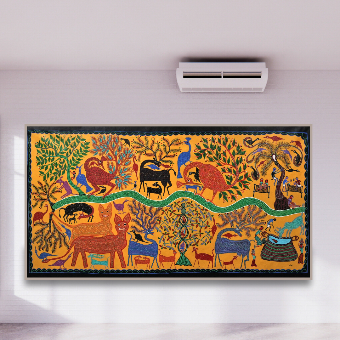 The connection between Bhil art paintings and nature is deeply rooted, and this original artwork by Bhuri Bai beautifully represents it. This painting, ‘The Green River - Life in the Village’, shows a long tree as a river that runs between the village and how a community thrives around it. On both sides of this green river is the abundance of flora and fauna co-existing peacefully as humans continue with their daily chores. Bhil art is widely known for its depiction of local folklore, festive traditions and larger-than-life motifs of natural elements. Portraying a similar subject in this work, Bhuri Bai has used tiny colourful dots, lines and vibrant colours against the bright yellow background, adding a rhythmic beauty and depth to the painting. These colourful dots stand as a unique identity of the Bhil art. Through her unique visual narration, Bhuri Bai has beautifully portrayed the harmony of co-existence between nature and community.