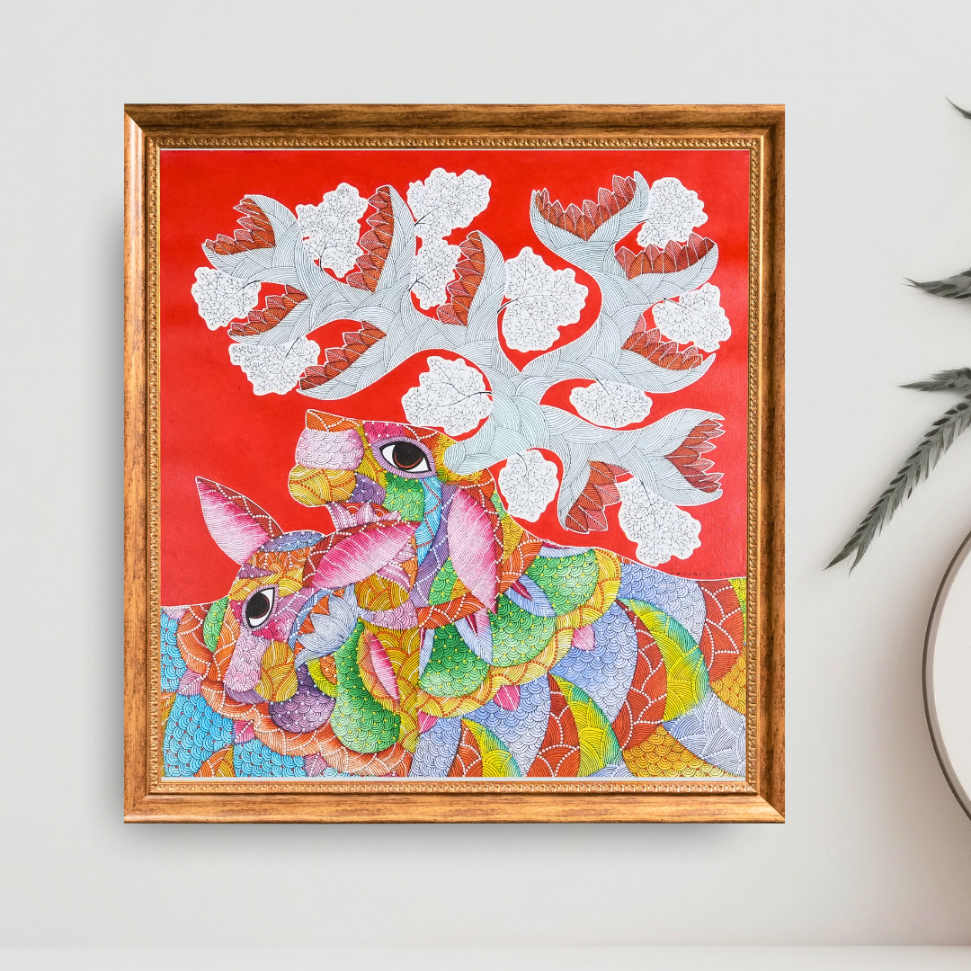 This beautiful Gond painting, titled The Love of a Mother, tenderly captures the deep and selfless bond between a mother and her child. Created by renowned Gond artist Venkat Singh Shyam, the artwork uses vibrant colours, fluid lines, and the distinctive dot-and-line patterns of Gond art. This hand-painted artwork captures the selfless love and care a mother provides to keep her child happy and healthy. This is as true for animals as it is with human beings, and in this image, artist Venkat Singh Shyam showcases it with gentle cows portrayed as the central figures, symbolising maternal care, protection, and warmth. In Hindu mythology and culture, the cow is a universal symbol of motherhood, and this depiction in classic Gond art style is a great tribute.