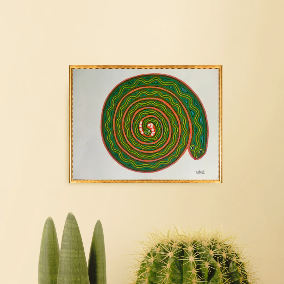 If you are looking for nature-inspired Indian art paintings, this Bhil painting by Buri Bai is a great pick. In this Bhil folk art painting simply titled ‘The Mother Snake and her Eggs’, you can see the reflection of the protectiveness of a mother. Curled carefully around her unhatched babies, the mother snake becomes a living shield, her smooth form coiling gently around the cluster of delicate white eggs. This powerful yet tender moment captures the essence of maternal instinct in wild animals - silent, fierce, and unwavering. As she waits patiently, guarding the tiny lives within, the scene symbolises the cycle of life and the deep bond between a mother and her unborn young.