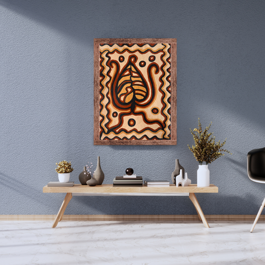 The Sacred Circle' by Parwati Devi speaks of creation, fertility, and the endless rhythm of nature. The flowing lines and soft waves seem to move with the quiet breath of the earth, where each curve holds a memory of renewal. At the centre, the sacred form recalls the womb of the Mother Goddess, a symbol of life and balance deeply rooted in the Sohrai tradition. Painted with natural earth colours, the work carries the warmth of Jharkhand’s soil, echoing the ancestral practice of women painting blessings on mud walls with clay, ash, and devotion.
