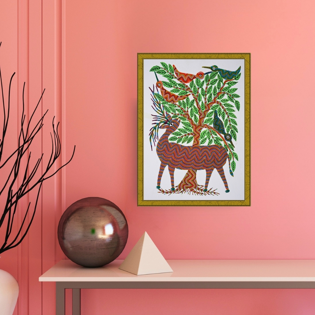 Ramesh Katara is the artist behind the painting The Sacred Grove: Where Deer Rest and Birds Sing in the Bhil art style. This vibrant painting shows a moment of peace in nature. A calm deer stands under a green, leafy tree while colorful birds sit on the branches. The patterns on the deer and the leaves show the connection to the earth and its rhythm. The painting tells a story of friendship, showing how the deer, the tree, and the birds are linked in the cycle of life. It is more than just an image; it is a safe space where all beings are in harmony together.