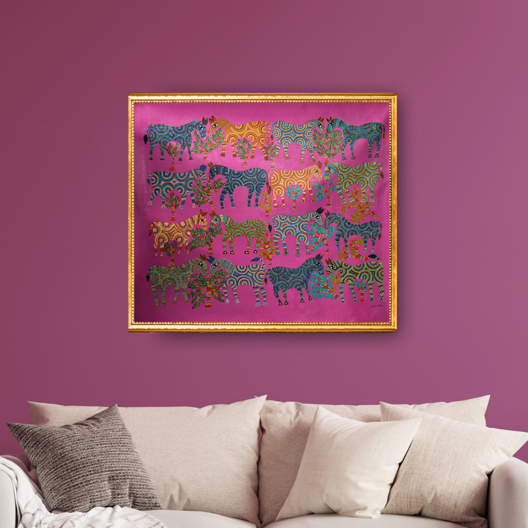 In this painting, the horses are adorned with circular patterns that blend seamlessly with the bright trees, creating a sense of visual harmony. Set against a vibrant pink background, the artwork beautifully highlights the colourful horses arranged in a symmetrical form.