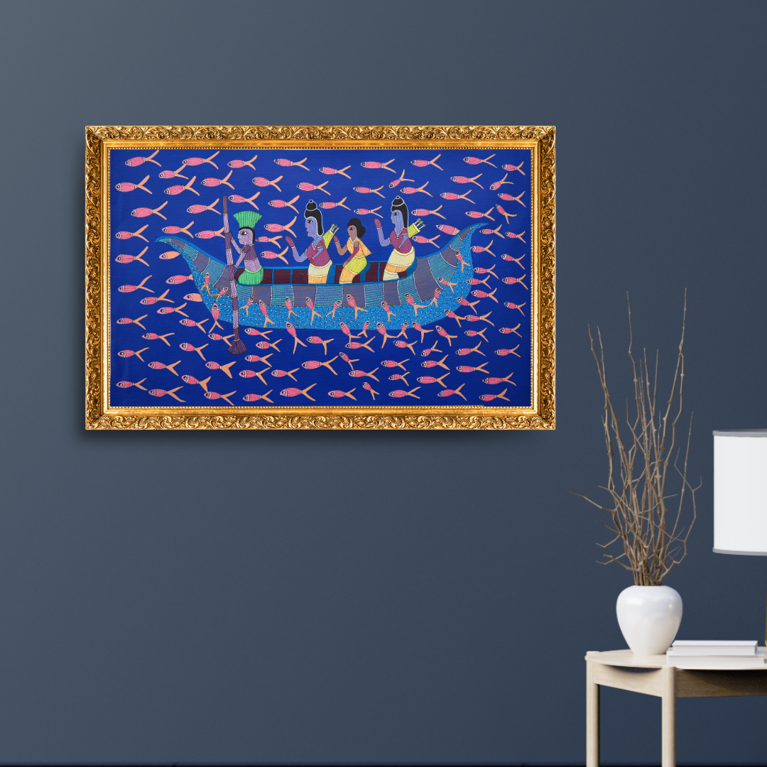 In this captivating art piece by Suresh Dhurve, a scene from the epic Ramayana comes to life with intricate detail and vibrant storytelling. Lord Ram, Devi Sita, and Lord Laxman are gracefully travelling in a boat across the sacred Ganga river, with a rower guiding them through the serene waters. The river teems with life as numerous fish swim beneath the surface, adding a sense of tranquillity to the scene. Dhurve's masterful use of dots and lines creates beautiful patterns, infusing the artwork with a sense of depth and richness. This piece elegantly captures a moment of divine journey and harmony, showcasing the artist’s dedication to both mythology and intricate Gond artistry.