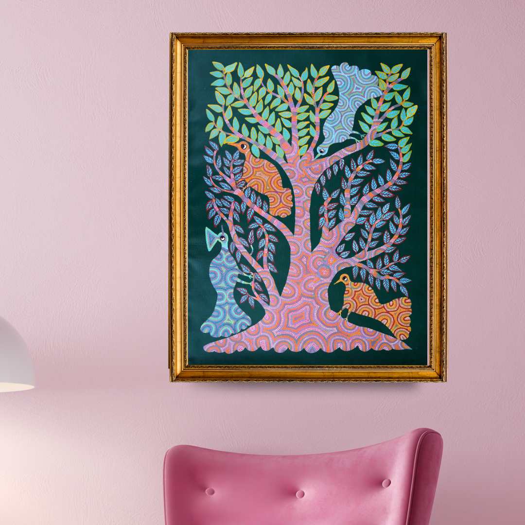 Bring home the serenity of nature with ‘The Sheltering Tree’, a stunning hand-painted Bhil artwork by tribal artist Rakesh Bhavor from Madhya Pradesh. Known for his mastery of traditional Bhil art, Bhavor captures the delicate harmony between nature and life in this captivating composition. The painting features a majestic tree with wide-spreading branches, offering shelter to a cluster of vibrant peacocks nestled among its foliage. Each element is rendered with bold lines, earthy hues, and the signature dotted detailing that defines Bhil artistry, symbolising interconnectedness and peaceful coexistence. Executed in acrylic on canvas, this piece stands out with its dynamic yet soothing visual rhythm. The use of layered dots not only enhances the texture but also embodies storytelling passed down through generations. The use of hues of pink and green for the tree, along with blue and orange hues for the birds, creates a unique colour scheme for the painting, which creates a different visual melody that keeps the viewers engrossed in its beauty. The tree, as a life-giving form, and the birds, as gentle inhabitants, together evoke a deep sense of balance and tranquillity.