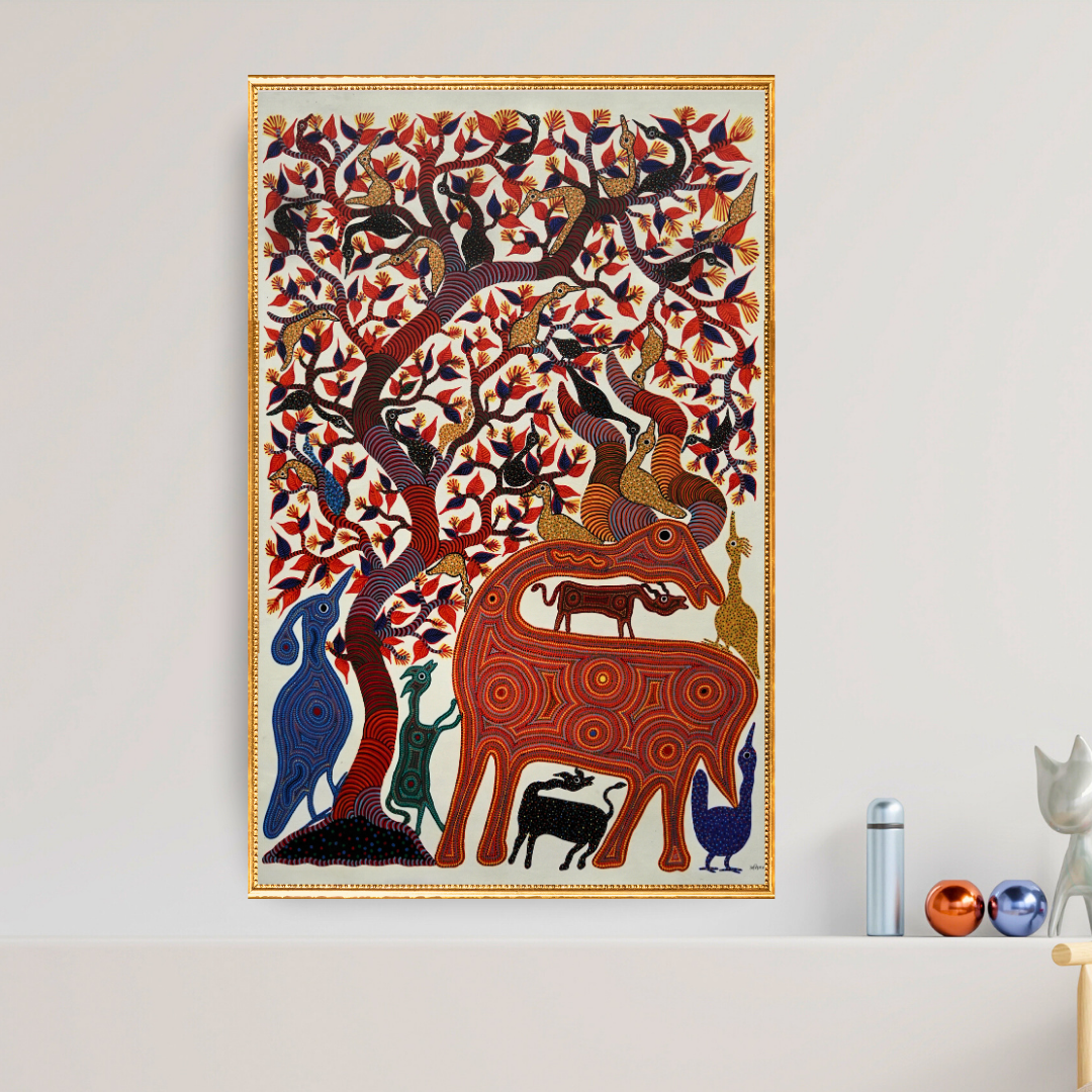 In this painting, he portrays a scene where a deer is standing under the canopy of a tree filled with playful birds. As the deer stands calmly, he is surrounded by the birds sitting on his horns, a little baby deer on his back and other animals and birds trying to climb on him. The painting showcases a joyful and cheerful scenario where the vibrant colours, colourful dots, and delicate lines bring the scene to life. The use of warm colours like tones of orange combined with the earthy tones of blue, ochre, and green adds to the color symphony of the composition, keeping it playful and viewers engrossed. The detailed craftsmanship combined with visual storytelling skillfully portrays the narratives of nature and wildlife depicting the true Bhil tribal art mastery. The dimensions make it perfect for display on walls, whether as a centrepiece or part of a curated art collection.