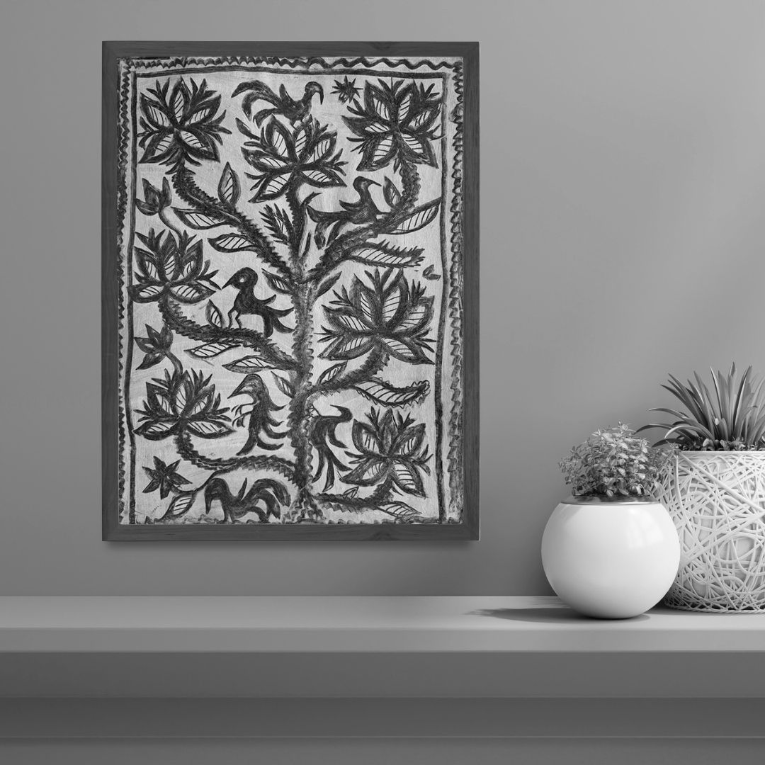 The Sunlit Grove by Malo Devi is a graceful interpretation of the Tree of Life, rendered in the traditional monochrome Khovar style. The composition unfolds as a living tapestry where blooming sunflowers merge with birds and branches, creating a sense of rhythmic harmony. The entire scene radiates quiet vitality, embodying the spiritual link between sunlight, fertility, and growth.