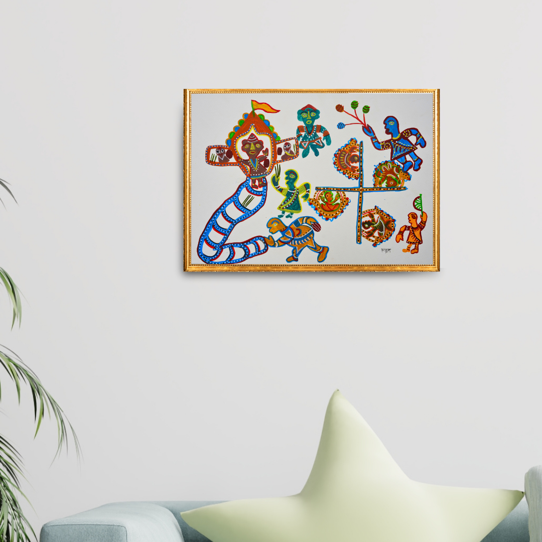"The Village Fair Around the Temple" by Sakun Bai beautifully captures the vibrancy of a religious celebration in a village. The artist brings to life the festive atmosphere, where villagers gather around the temple, engaging in rituals and enjoying the lively fair. The painting reflects the deep-rooted traditions, cultural essence, and collective spirit of the community. Intricate patterns and earthy tones highlight the harmony between faith and festivity. Through this artwork, the artist portrays the joy, devotion, and togetherness that define such special occasions in village life.