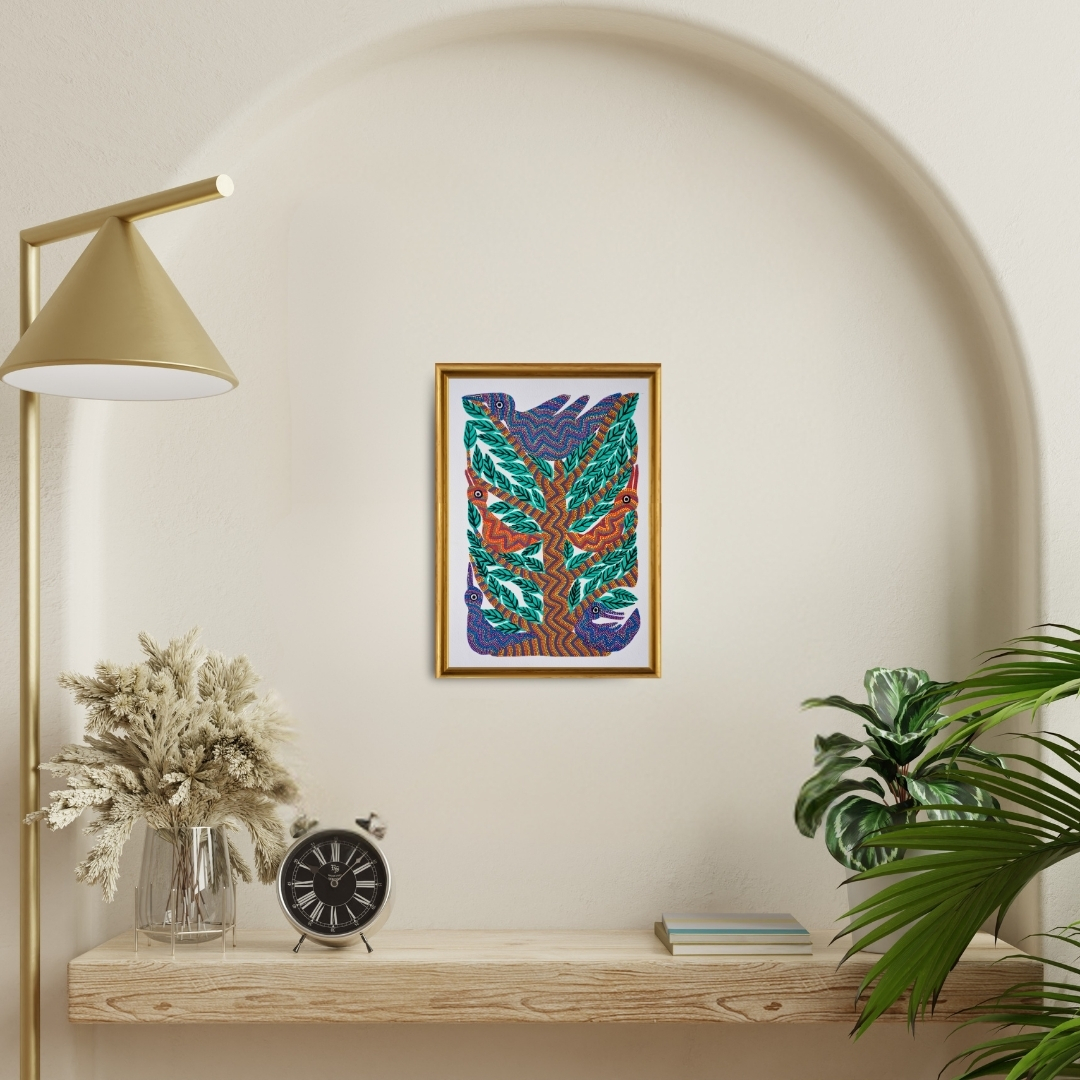 The artist Ramesh Katara has created the Tree of Harmony in the Bhil tribal art style. This artwork features a vibrant tree filled with life. Boldly colored birds in shades of blue, purple, and orange are interwoven among the tree's branches. The tree itself is adorned with intricate dot and line patterns, surrounded by lush green leaves where the birds reside. This piece reflects the deep connection between nature and animals, a recurring theme in Bhil tradition, where trees are seen not merely as plants but as sacred homes of life and energy.