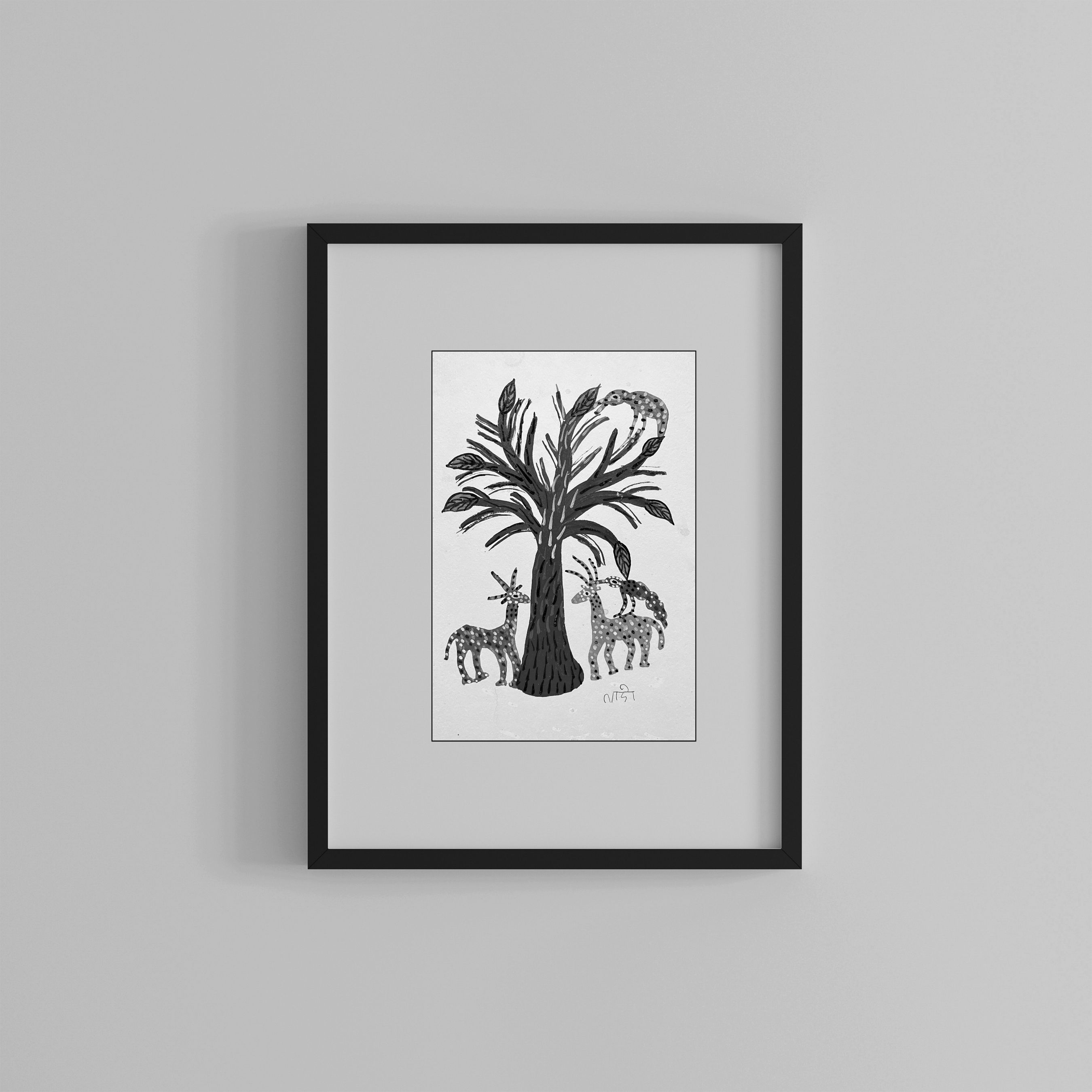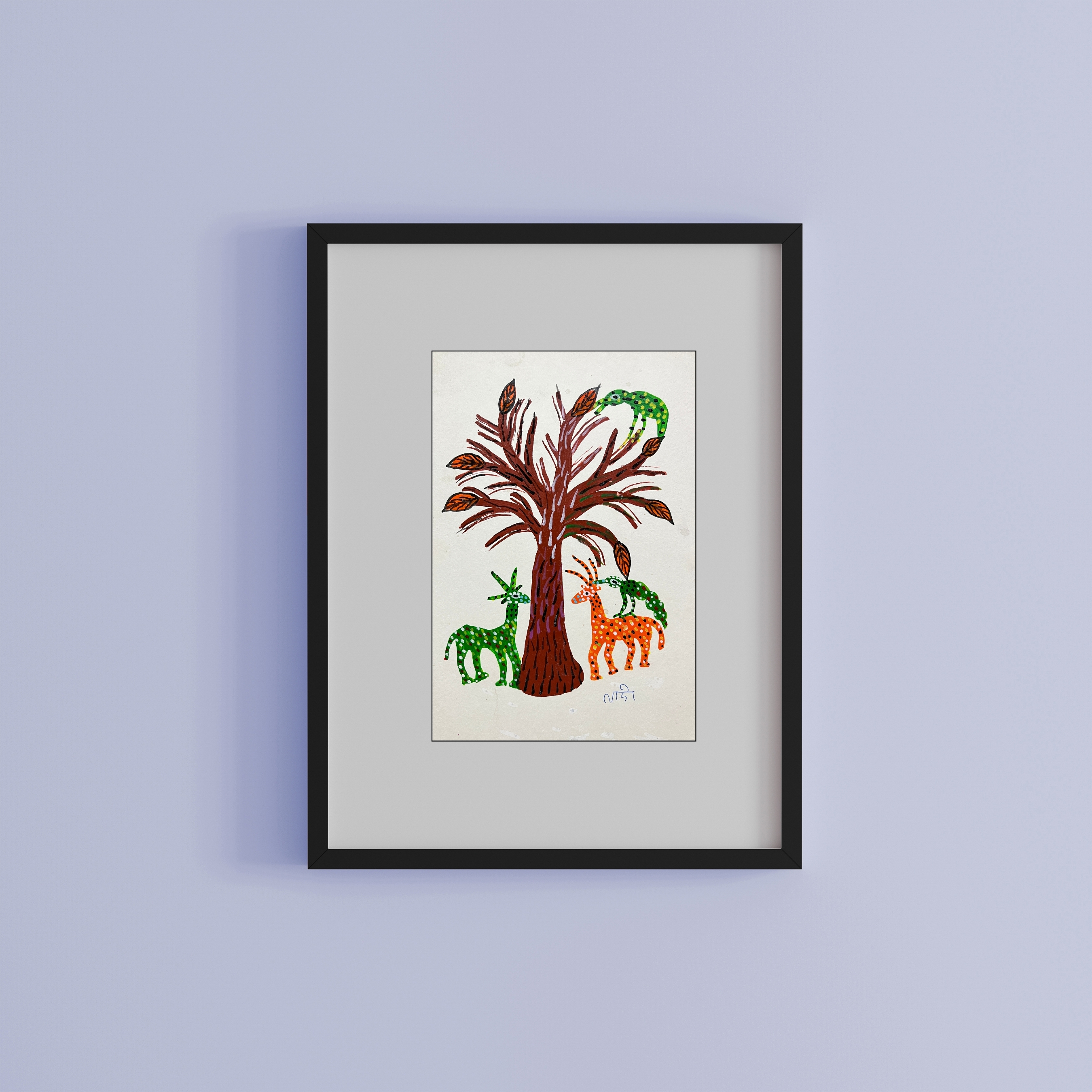 - The composition brings together the Tree of Life motif with forest animals and a serpent, reflecting the rich, layered storytelling tradition of Bhil tribal art.