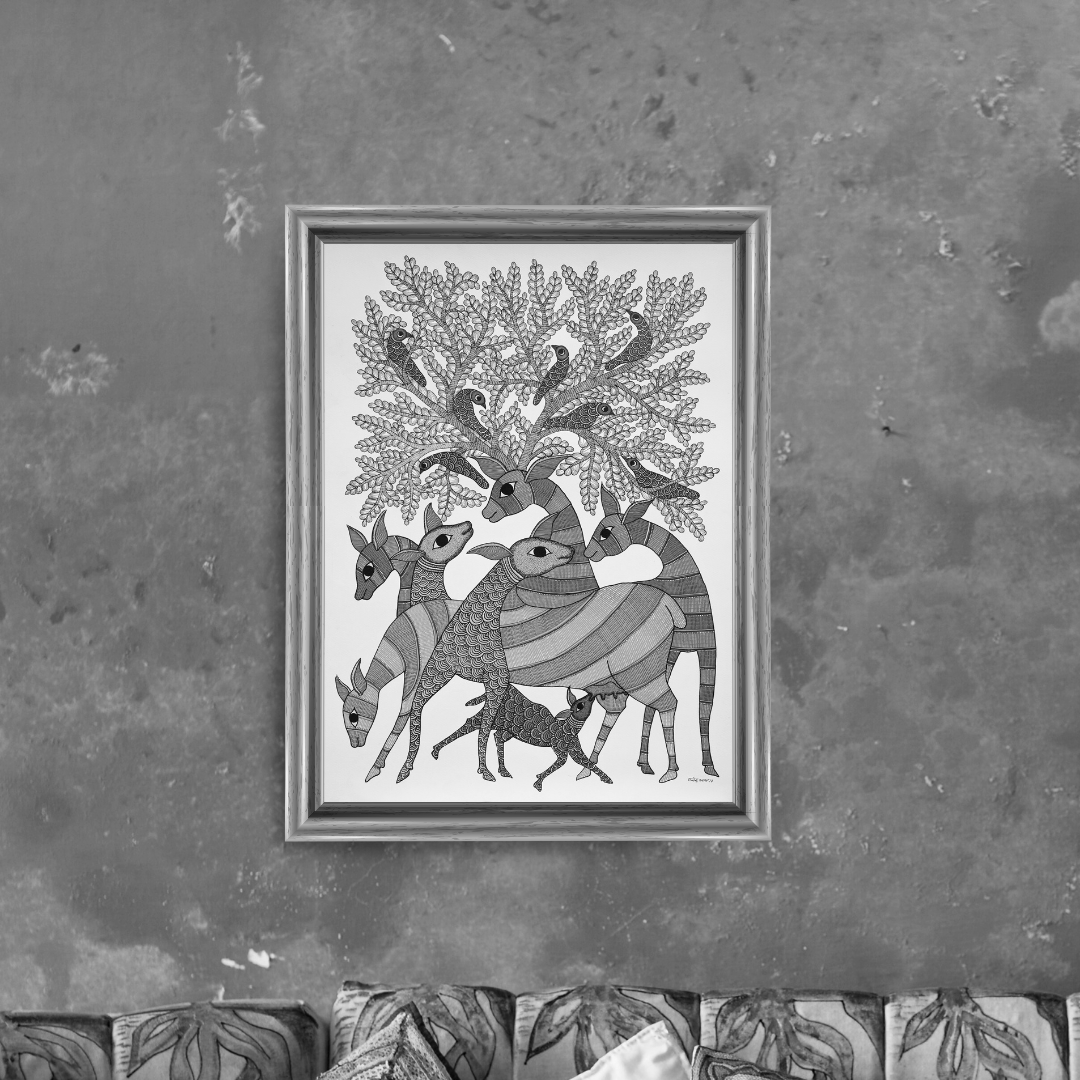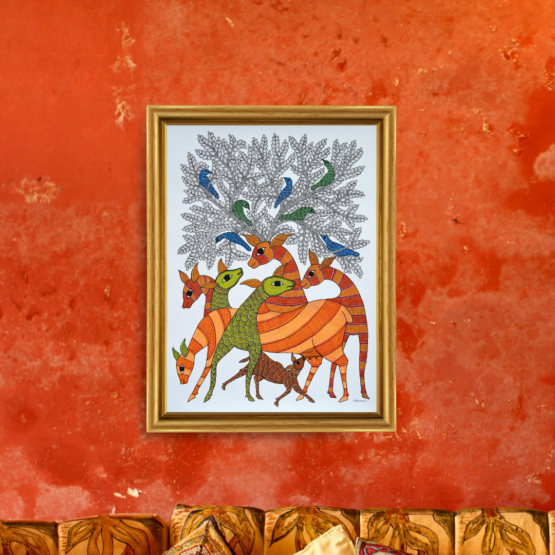 Rendered in the traditional Gond style, the artwork features fine dots, lines, and flowing patterns that bring texture and movement to every element. The careful handwork and vibrant colours make this painting not just a visual delight but a cultural expression of care and coexistence.
