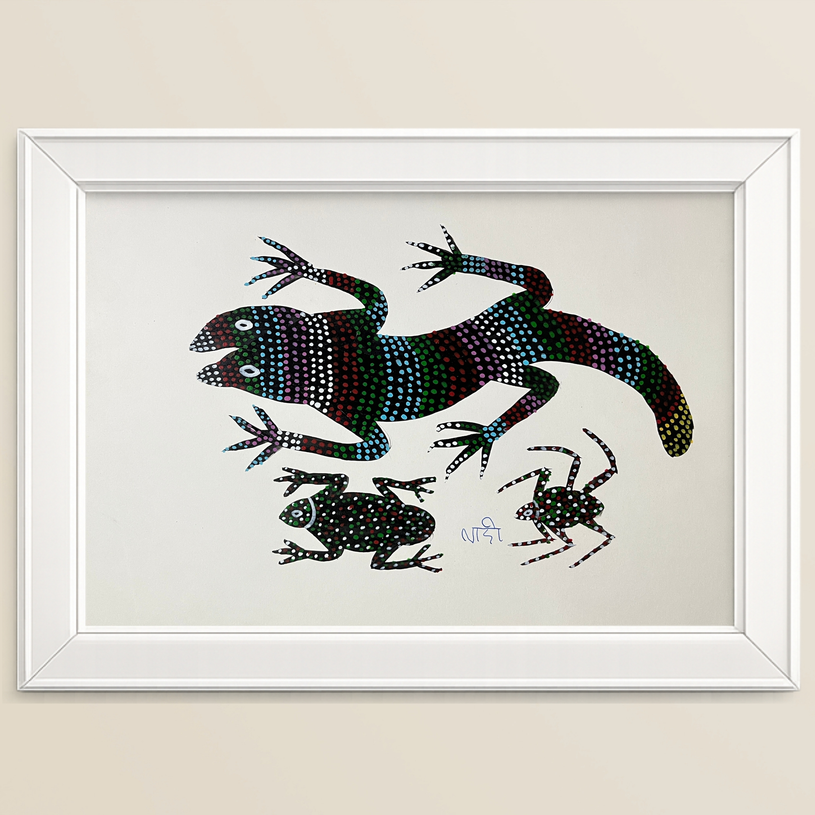 A large dark lizard stretches diagonally across this handmade painting by Lado Bai, its powerful body covered in a constellation of multicoloured dots in cyan, pink, green, white and red that glow against the deep black and green surface like scattered jewels. Two smaller frogs accompany it, one in the upper left and one in the upper right, their compact bodies dense with white and red dots, their splayed limbs and wide eyes giving them an alert, watchful presence. The three creatures occupy the clean white ground with easy confidence, their dark forms commanding the space with a graphic boldness that is at once minimal in composition and richly complex in surface detail. Painted in acrylic on paper, the work showcases the Bhil pointillist technique at its most concentrated, where thousands of individually placed dots transform flat, dark silhouettes into shimmering, gem-like surfaces.