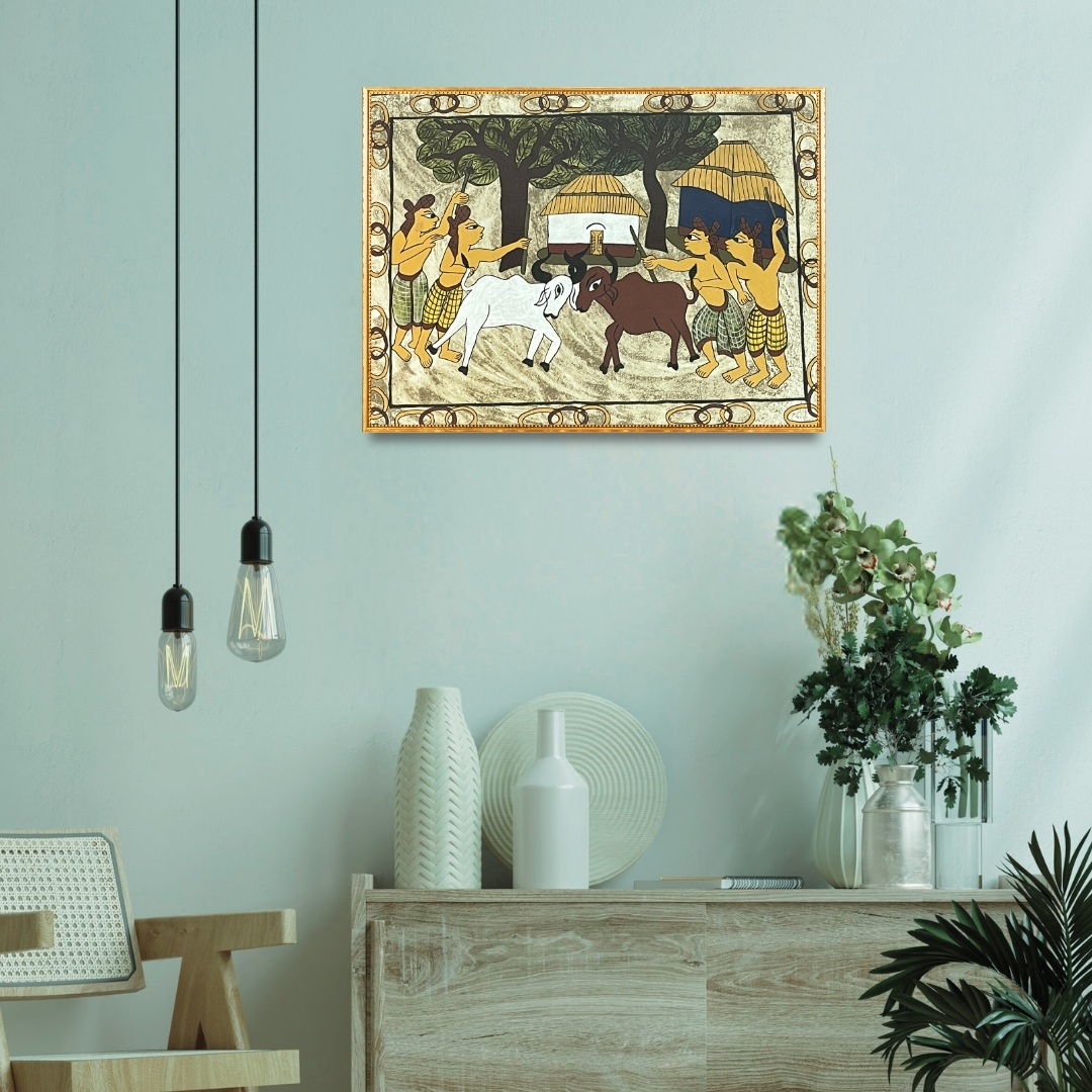Working within the storytelling traditions of tribal and Paitkar folk art, Kishor Gayen translates scenes of recreation and interaction into structured visual narratives. In acrylic on canvas or paper, he records gestures of movement, play and social connection that define everyday life within the village community. Tribal Games becomes a reflection of shared joy and cultural continuity, where moments of play are preserved through colour, pattern and balanced composition.