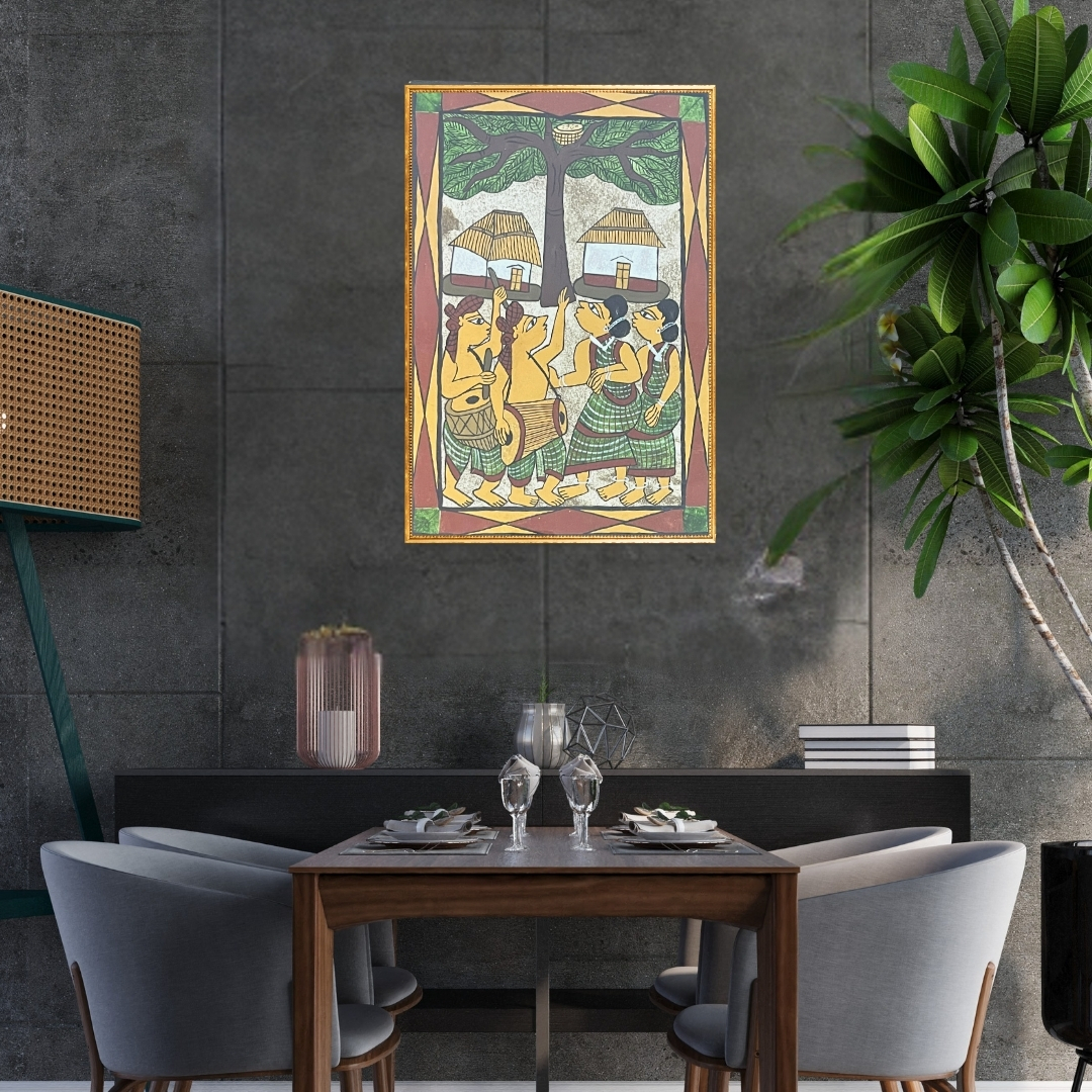 The composition unfolds horizontally in the narrative spirit of traditional Paitkar painting, allowing multiple moments of village life to appear within a single pictorial field. Bright colours—vermilion reds, warm yellows, deep blues and vibrant greens—are applied in flat planes that lend clarity and vitality to the scene. Patterned garments and repeating decorative motifs guide the viewer’s eye through the arrangement of figures.