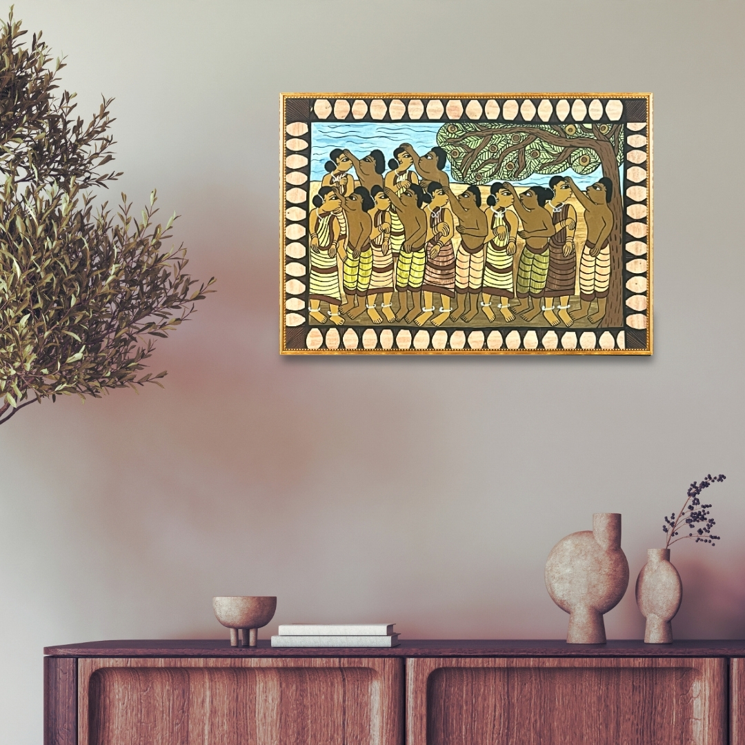 Working within the storytelling traditions of tribal and Paitkar folk art, Kishor Gayen transforms everyday experiences into structured pictorial narratives. In acrylic on canvas or paper, he records gestures of movement, work and social interaction that define village life. Tribal Lifestyle X becomes a reflection of shared identity and cultural continuity, where ordinary moments are preserved through colour, pattern and balanced composition.