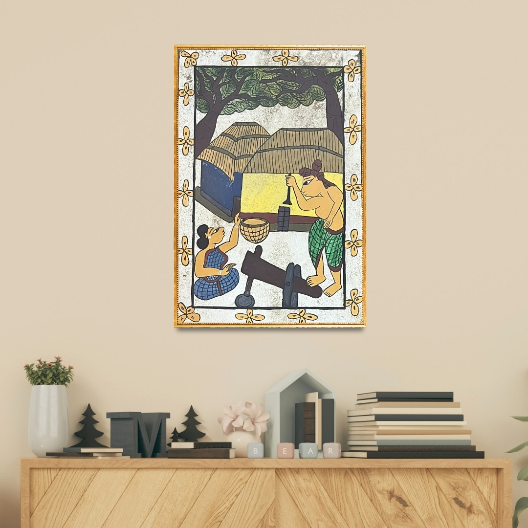 The composition unfolds horizontally in the narrative spirit of traditional Paitkar painting, allowing several moments of village life to share a single pictorial field. Bright colours—vivid reds, warm yellows, deep blues and vibrant greens—are applied in flat planes that lend clarity and vitality to the scene. Patterned garments and repeating decorative details establish a rhythmic surface that guides the viewer’s eye through the arrangement of figures.