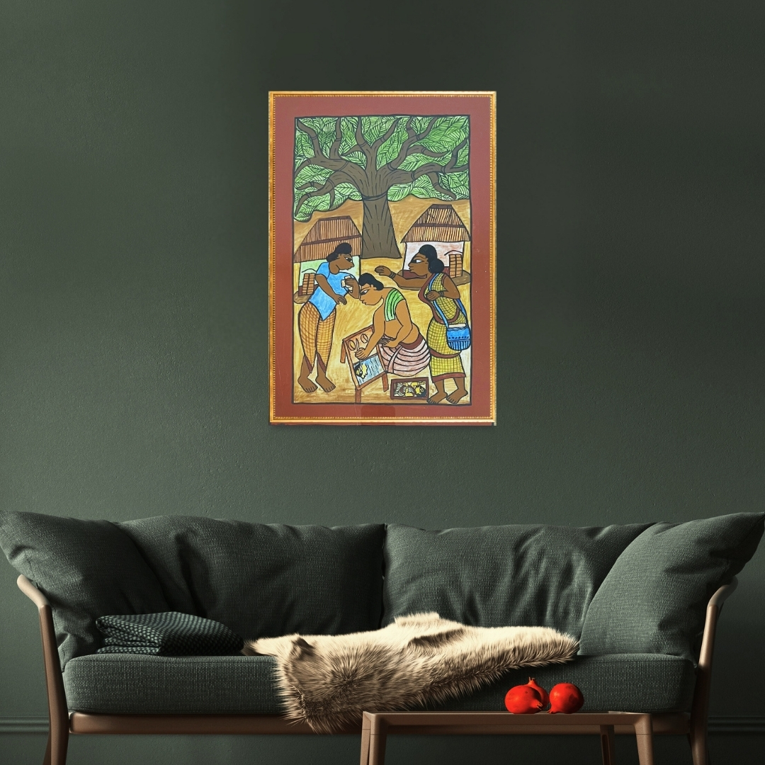The composition unfolds horizontally in the narrative spirit of traditional Paitkar painting, allowing multiple moments of village life to appear within a single pictorial field. Bright colours—vermilion reds, warm yellows, deep blues and vibrant greens—are applied in flat planes that bring clarity and vitality to the scene. Patterned garments and repeating decorative motifs create a rhythmic surface that guides the viewer’s eye through the arrangement of figures.