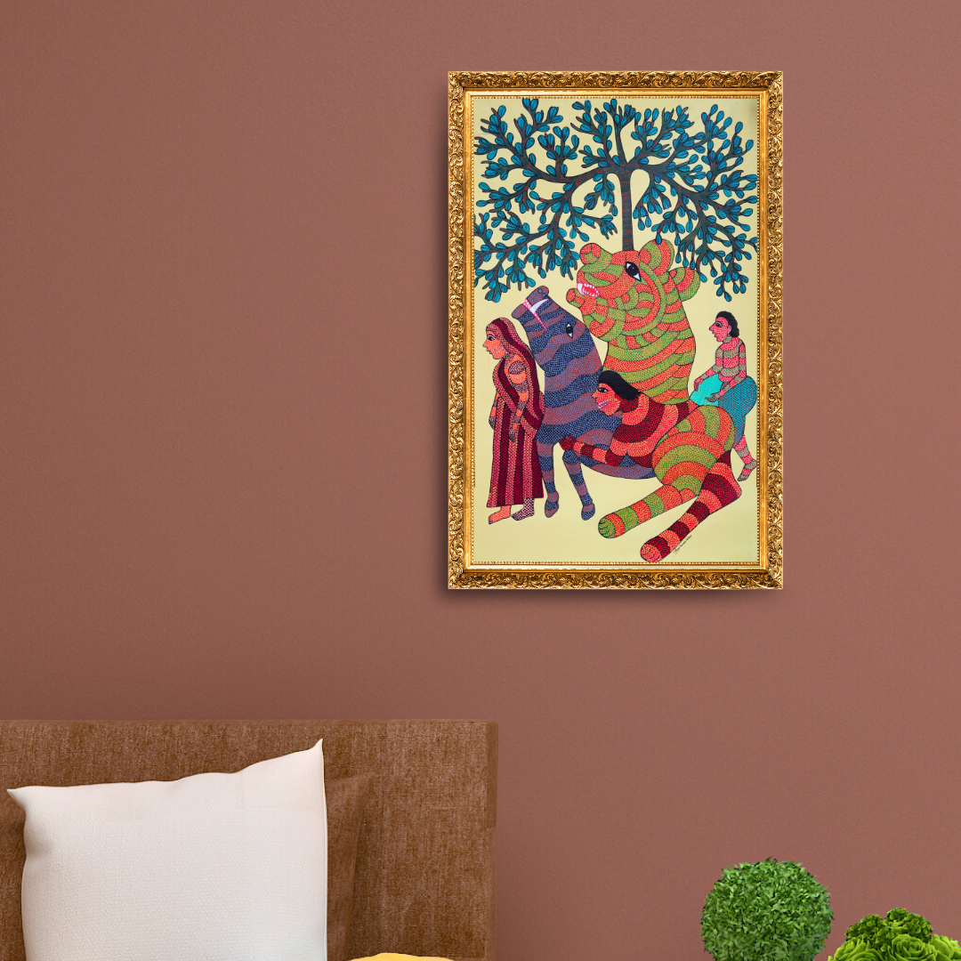 In Unity Among Beings, renowned Gond artist Ravi Tekam presents a captivating vision of harmony between humans and animals, a core belief in Gond culture. This stunning piece features women and tigers journeying together beneath the shade of a sprawling tree, each figure rendered in bold hues of red, green, blue, and yellow, detailed with dots, dashes, and curved lines. These signature elements of Gond art add a textured rhythm to the scene, bringing both visual depth and symbolic meaning.