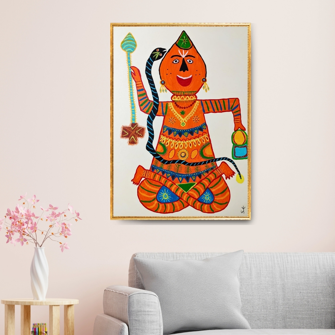 The all-over patterning of the figure's clothing and body, rendered in Baiga visual vocabulary, transforms the human form into a living textile of cultural memory. The serpent staff and ritual vessel situate the figure within a specific devotional iconography while keeping the mood festive rather than solemn. The radiant orange ground of the body against the plain white canvas creates an intensity of presence that makes the figure feel genuinely monumental at any scale. Jodhaiya Bai's status as a Padma Shri laureate and living master of the Baiga tradition makes this work both a significant artwork and an important cultural document.