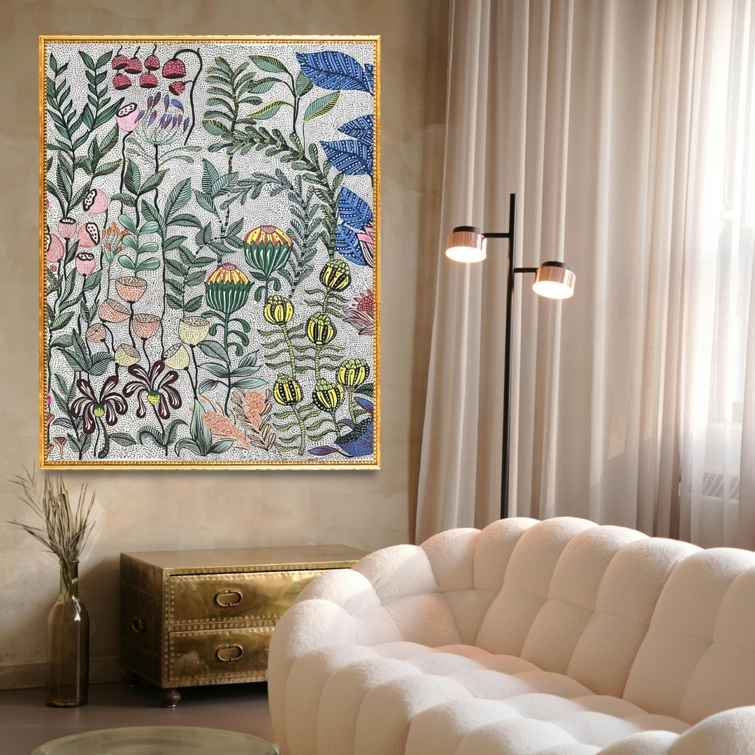 Santoshi Shyam, a significant contemporary voice within the Gond tradition of Madhya Pradesh, extends inherited visual language into bold, expressive compositions. Working in acrylic on canvas or paper, she approaches pattern as both identity and invocation, building presence through disciplined accumulation. Untitled I stands as a concentrated expression of this philosophy—an artwork where form, colour and repetition converge into a unified and resonant whole.