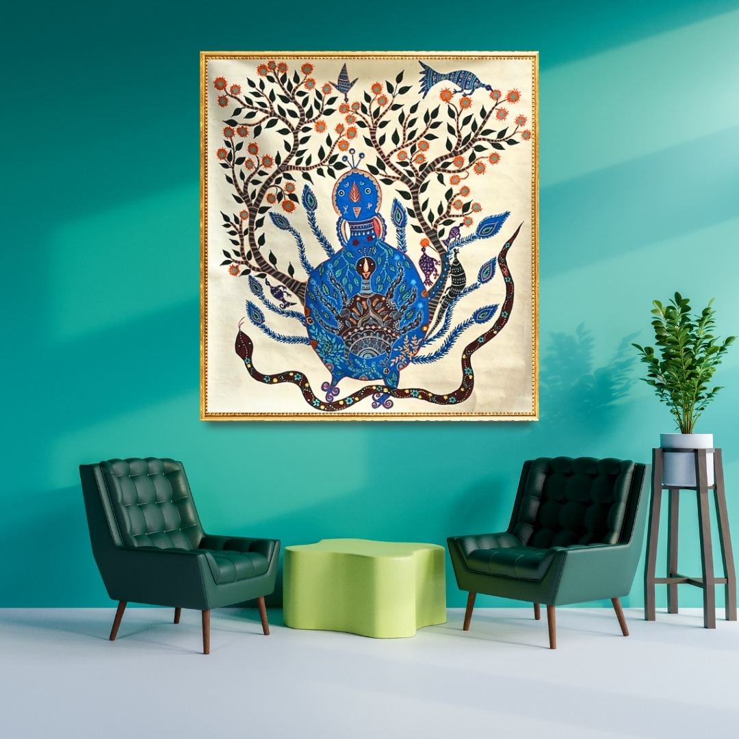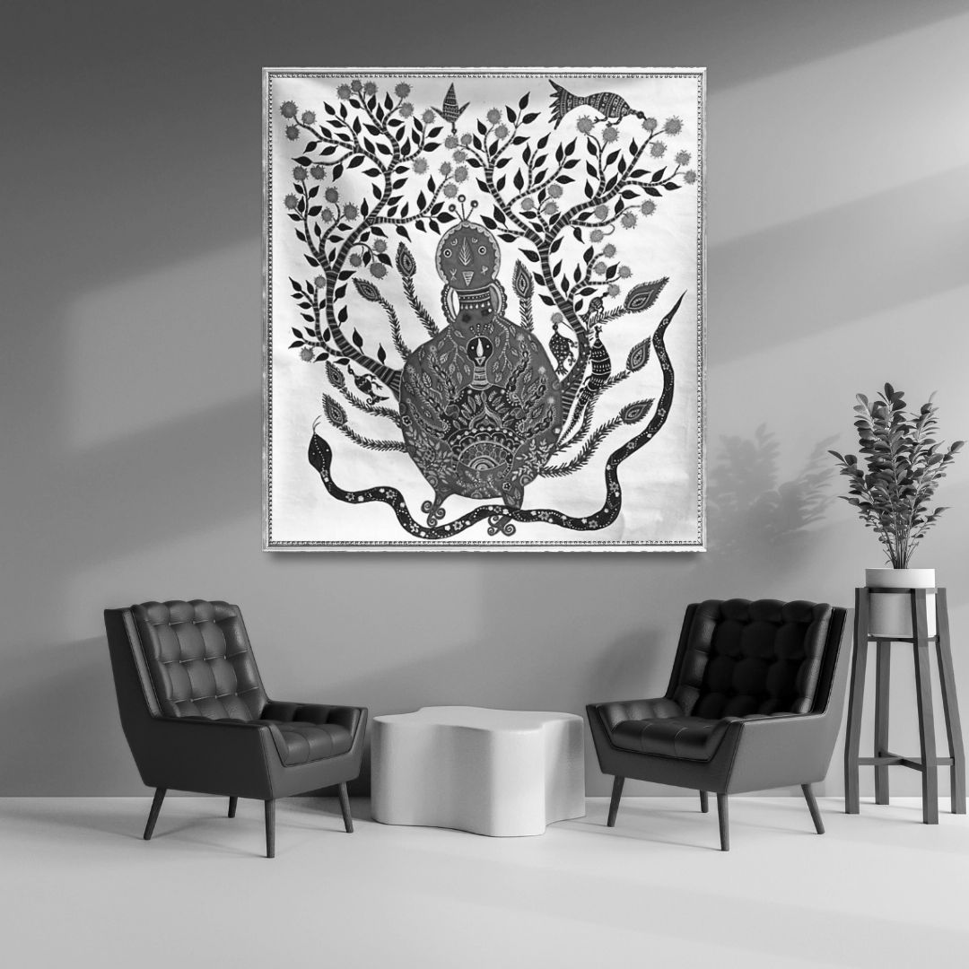 Working within the Baiga tradition of central India, Hema Baiga approaches painting as both memory and lived experience. In acrylic on canvas or paper, she carries forward a visual language rooted in community, ritual and environment, where storytelling and ornament are inseparable. Untitled V becomes an expression of this continuity—an artwork shaped by repetition, colour and the intimate knowledge of a world observed from within.